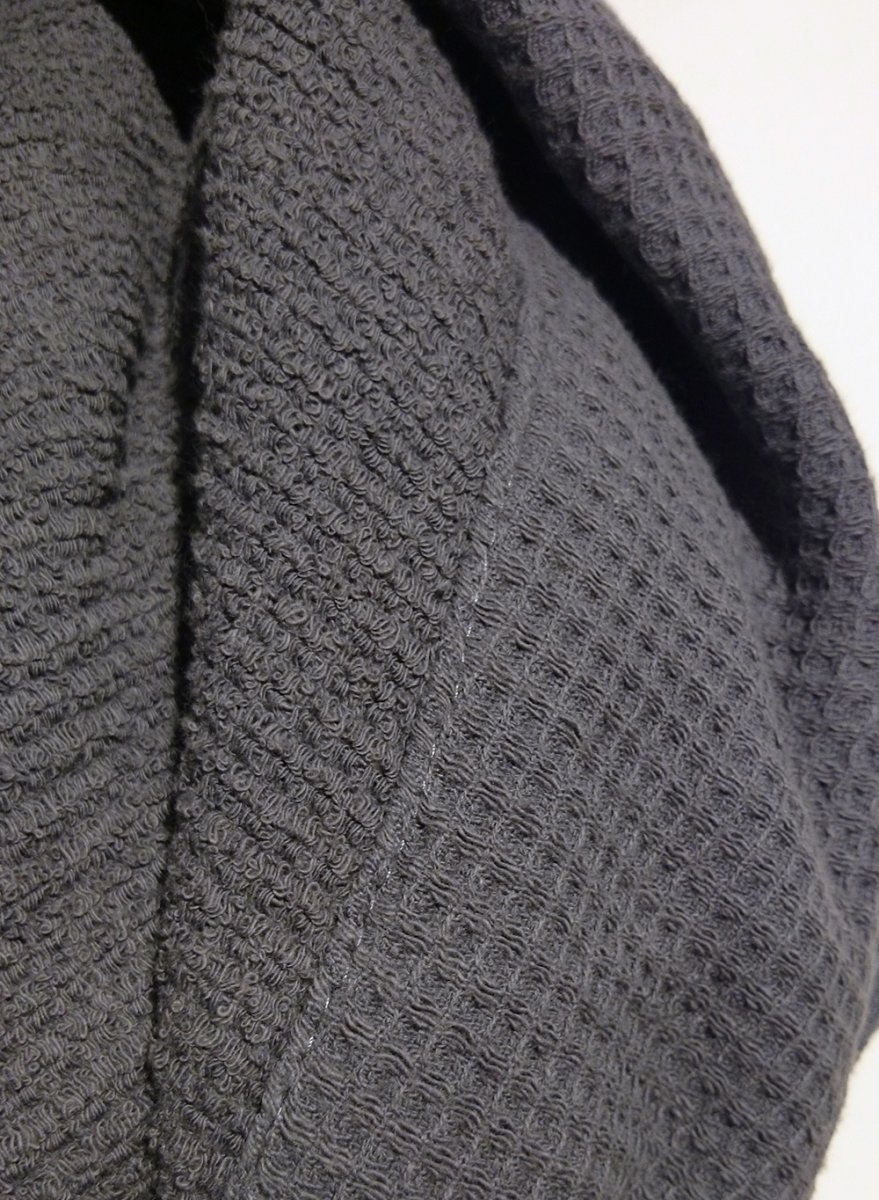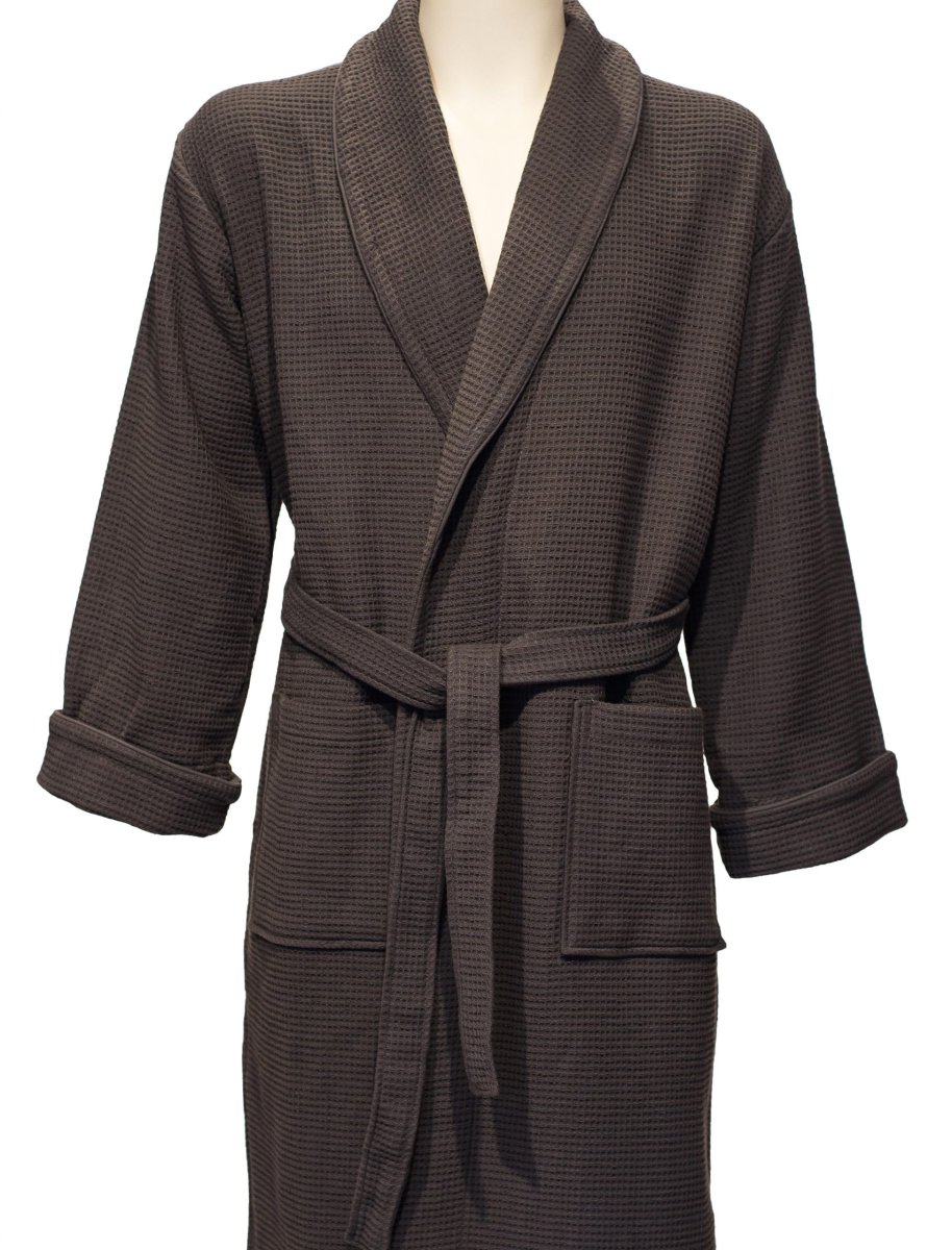 Badjas of kamerjas van luxe wafelkatoen met badstof aan de binnenkant, 100 % katoen. Geschikt voor thuis, maar ook zeker geschikt voor de sauna. De wafelstof aan de buitenkant met de sjaalkraag geeft een luxe indruk, en in de kleur antracietgrijs is dit een badjas voor alle seizoenen. Dit model valt groot, met extra lange mouwen: de maat M is vergelijkbaar met een herenmaat 50-52. De lengte is ca.130 cm.