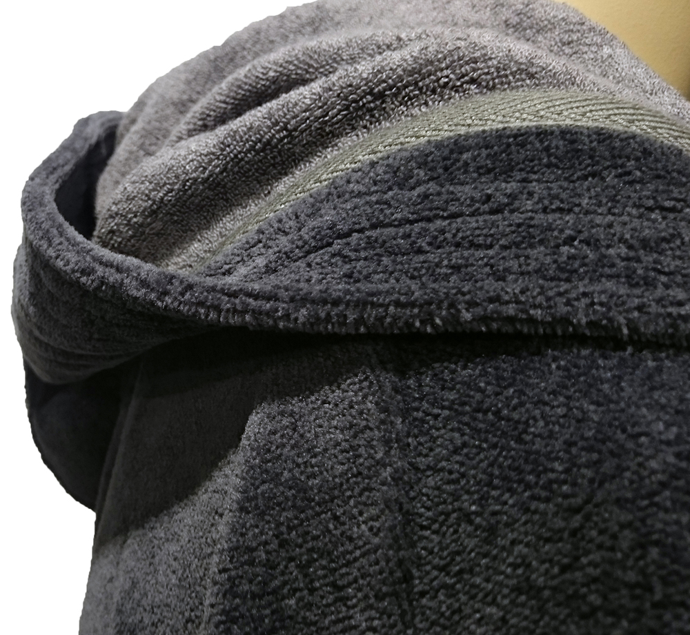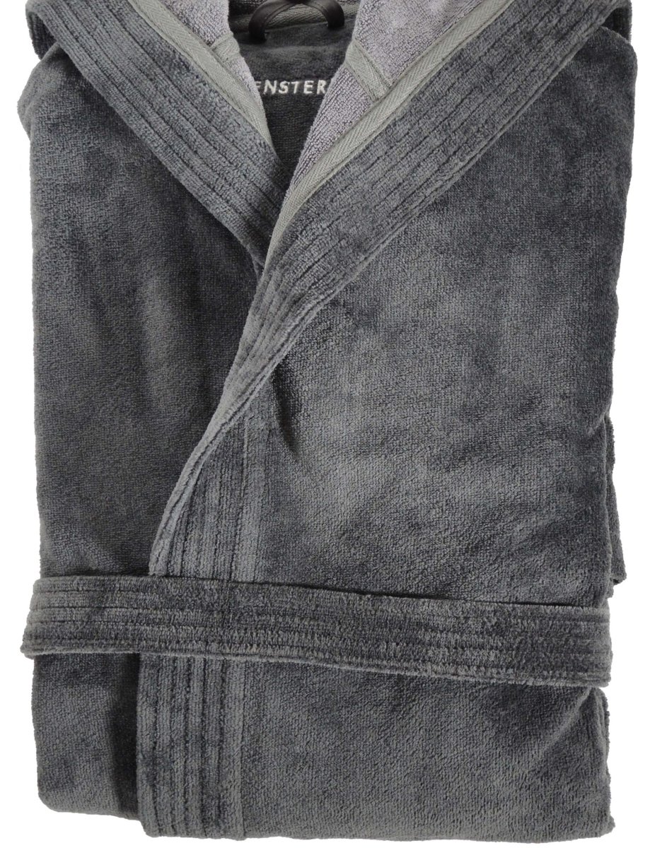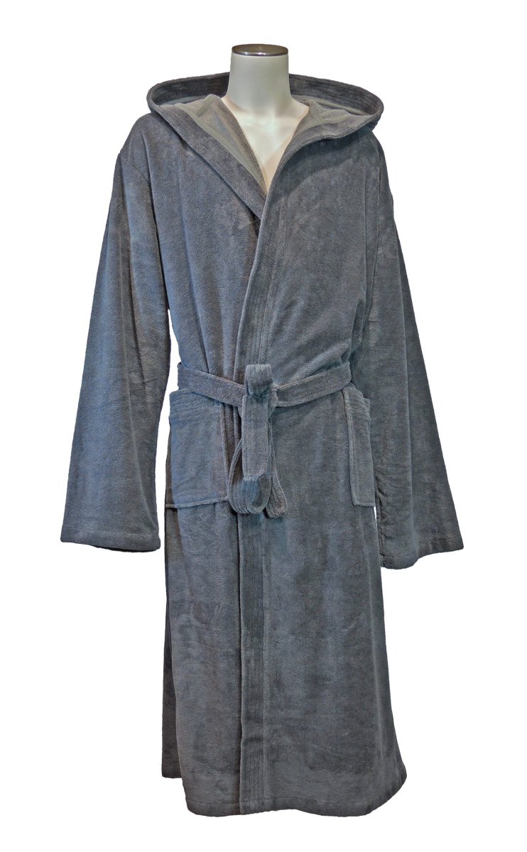 Saunabadjas met capuchon voor lange heren, in antracietgrijs. Van superzachte veloursbadstof: katoen, bamboe en microfaser. De stof is zacht, goed absorberend en snel weer droog; ideaal voor de sauna! Dit zijn badjassen voor lange heren in ruime maten XL, XXL en 3XL. De lengte is ca.145cm