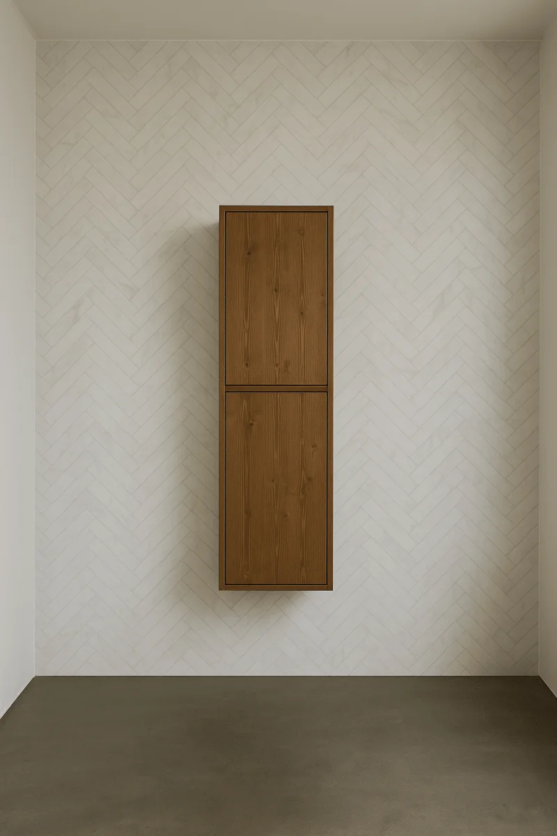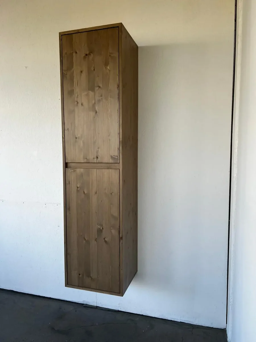Deze badkamerkast is gemaakt van massief 2cm dik rustiek vurenhout in de kleur: Oud bruin