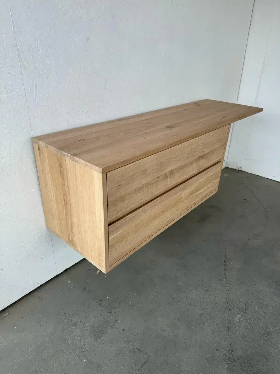 Dit badkamermeubel is gemaakt van 2cm massief rustiek eikenhout. Het meubel wordt standaard behandeld met 2k skylt of een van de 40 verschillende kleuren olie van rubio monocoat. Dit maakt het uitermate geschikt voor in de badkamer en makkelijk schoon te houden. Het meubel kan geleverd worden in verschillende kleuren. Dit meubel is behandeld in de kleur: 2k skylt voor behoud van de eiken kleur.