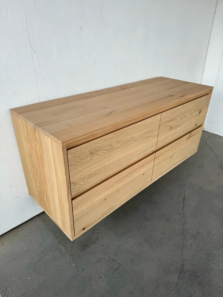 Dit badkamermeubel is gemaakt van 2cm massief rustiek eikenhout. Het meubel wordt standaard behandeld met 2k skylt of een van de 40 verschillende kleuren olie van rubio monocoat. Dit maakt het uitermate geschikt voor in de badkamer en makkelijk schoon te houden. Het meubel kan geleverd worden in verschillende kleuren. Dit meubel is behandeld in de kleur: 2k Skylt.