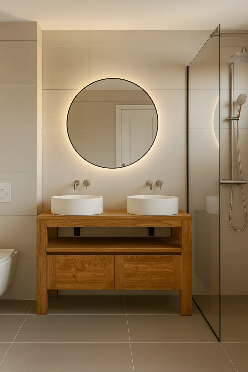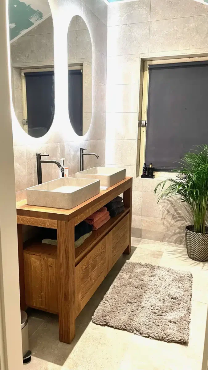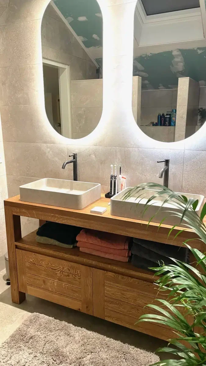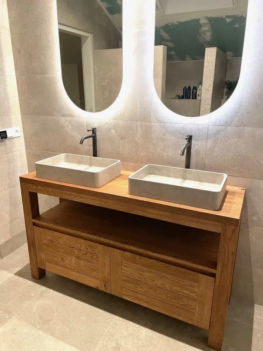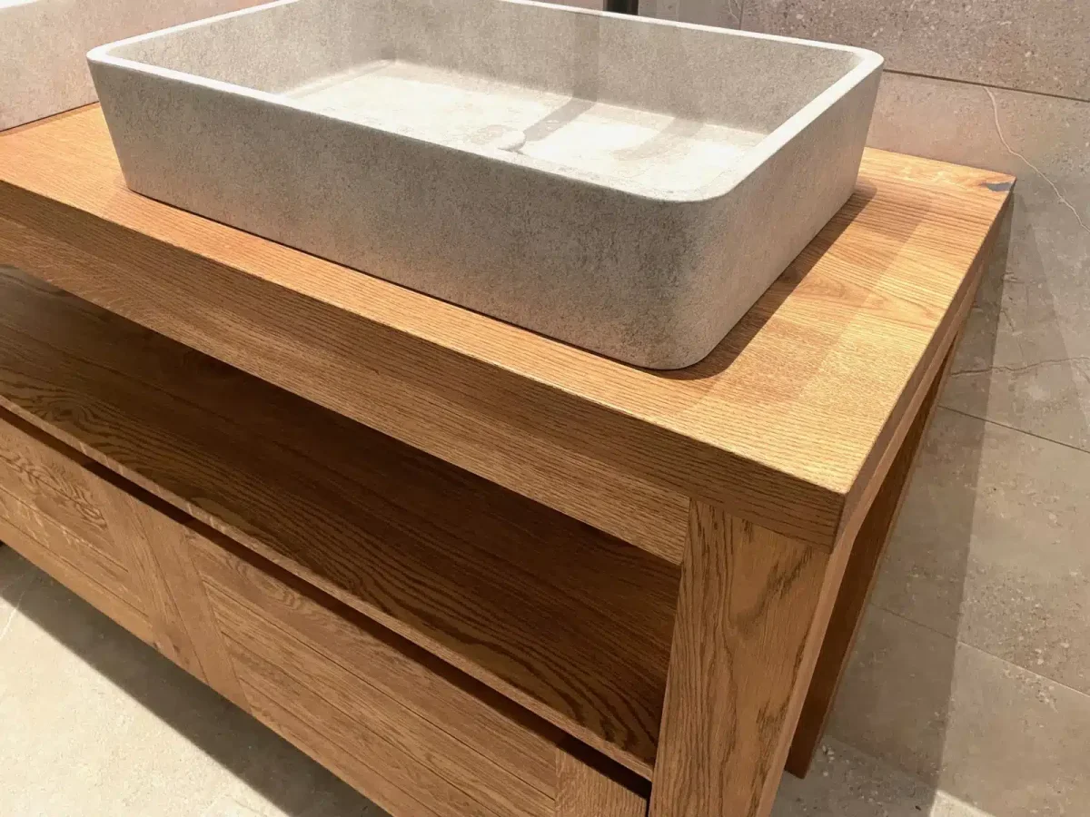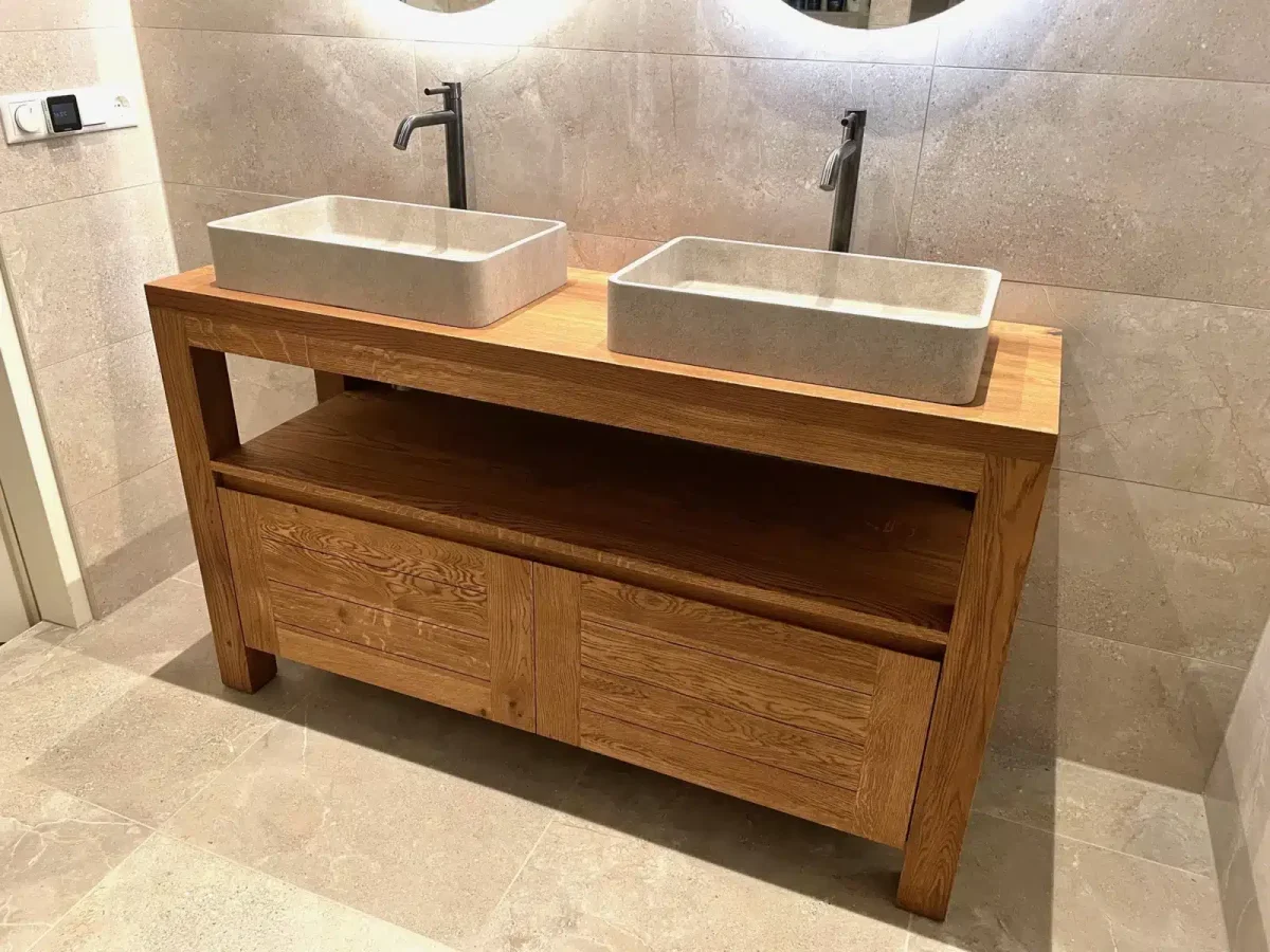 Dit badkamermeubel is gemaakt van 2cm en 4cm massief rustiek eikenhout. Het meubel wordt standaard behandeld met 2k skylt of een van de 40 verschillende kleuren olie van rubio monocoat. Dit maakt het uitermate geschikt voor in de badkamer en makkelijk schoon te houden. Het meubel kan geleverd worden in verschillende kleuren. Dit meubel is behandeld in de kleur: Castele Brown.