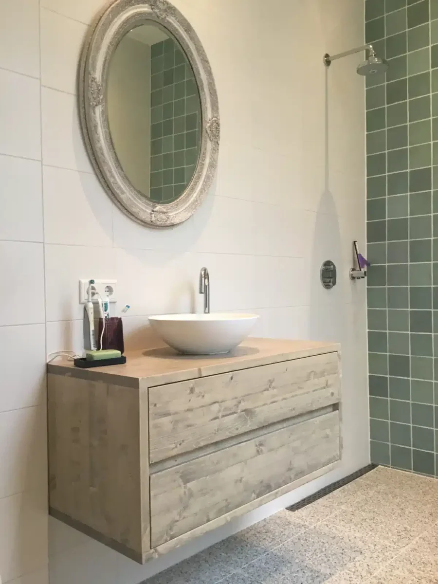 Dit badkamermeubel is gemaakt van geschaafd hout. Het meubel wordt standaard behandeld met drie lagen lak. Dit maakt het uitermate geschikt voor in de badkamer en makkelijk schoon te houden. Het meubel kan geleverd worden in verschillende kleuren. Dit meubel is behandeld in de kleur cementwash.