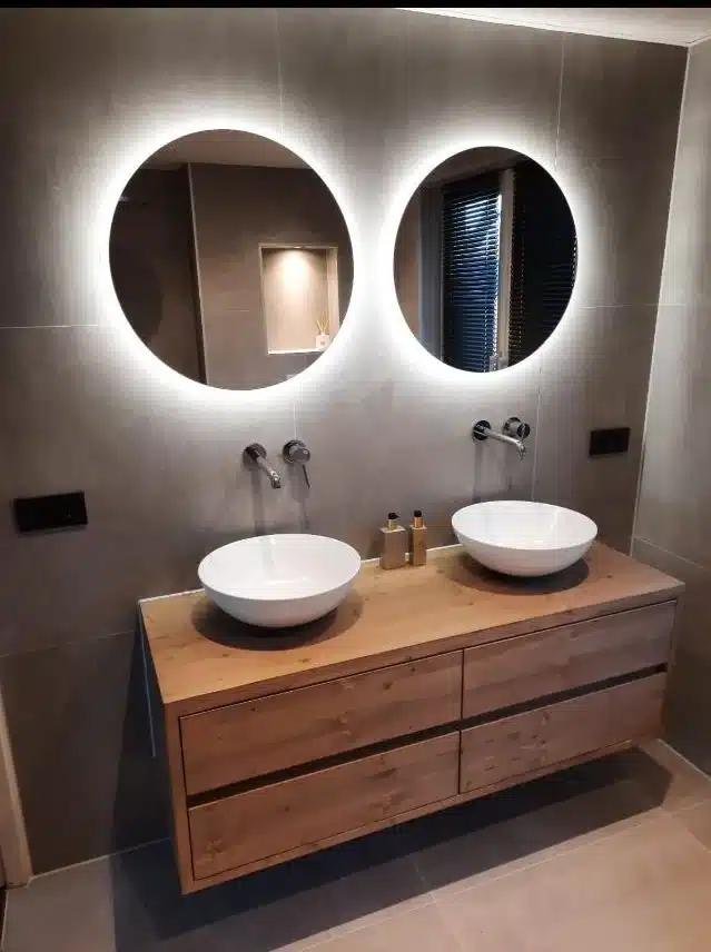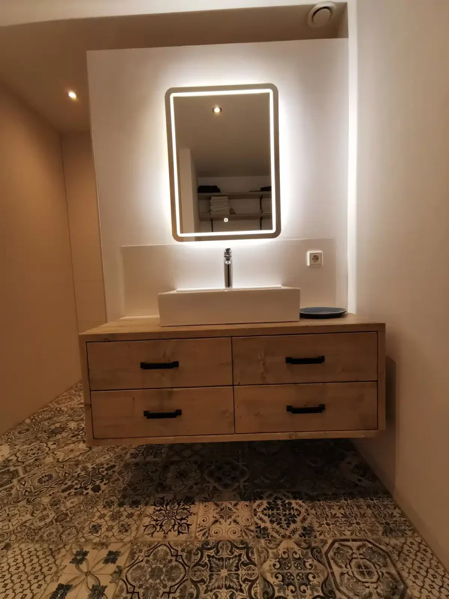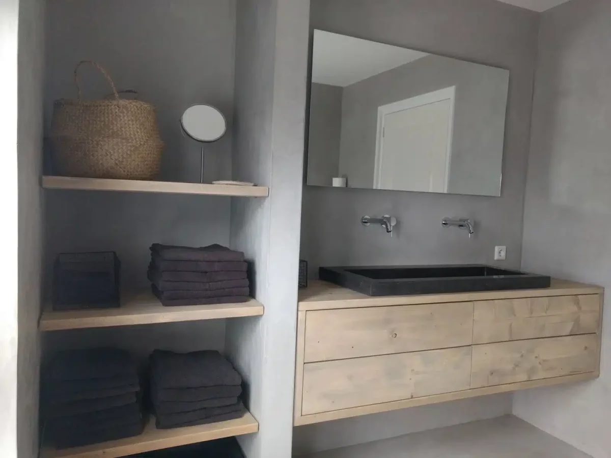 Dit badkamermeubel is gemaakt van geschaafd hout. Het meubel wordt standaard behandeld met drie lagen lak. Dit maakt het uitermate geschikt voor in de badkamer en makkelijk schoon te houden. Het meubel kan geleverd worden in verschillende kleuren. Dit meubel is behandeld in de kleur: cementwash.