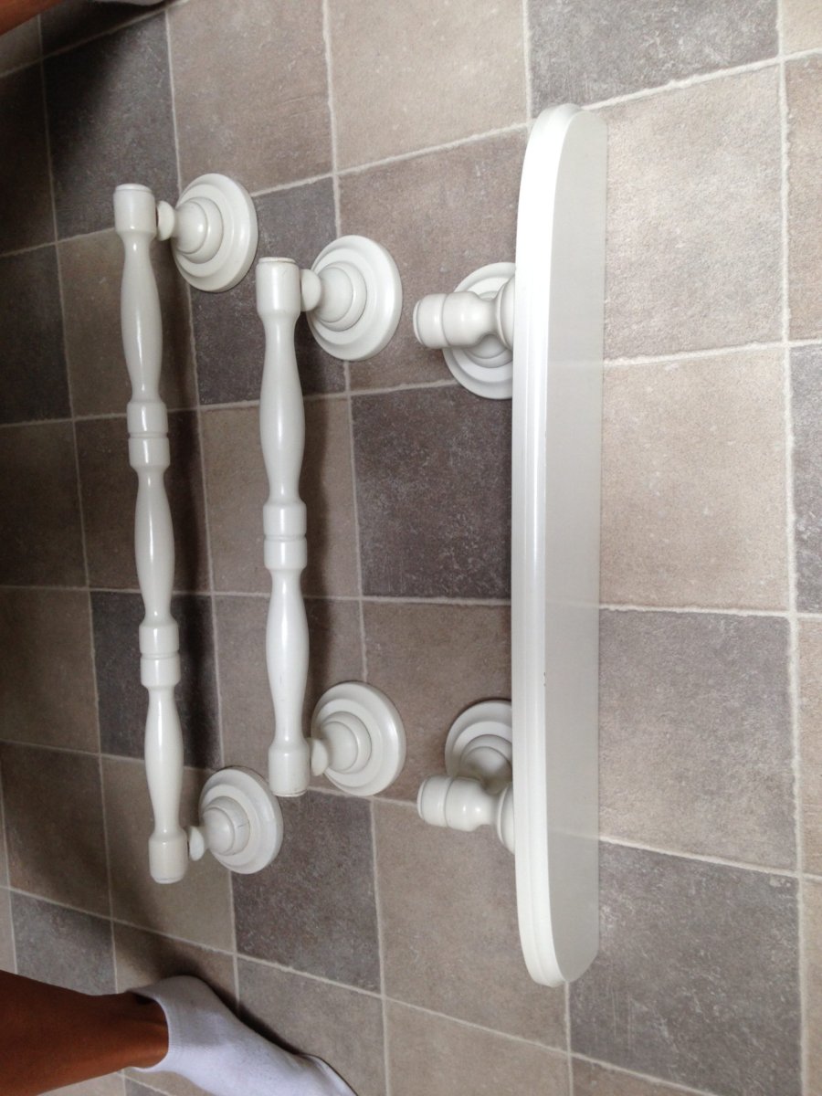 Brocante houten badkamerset bestaande uit een wandplankje met twee handoekrekjes.