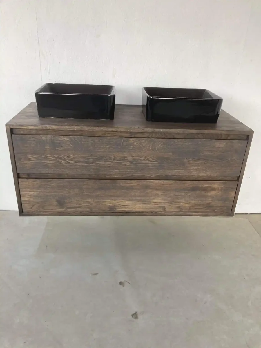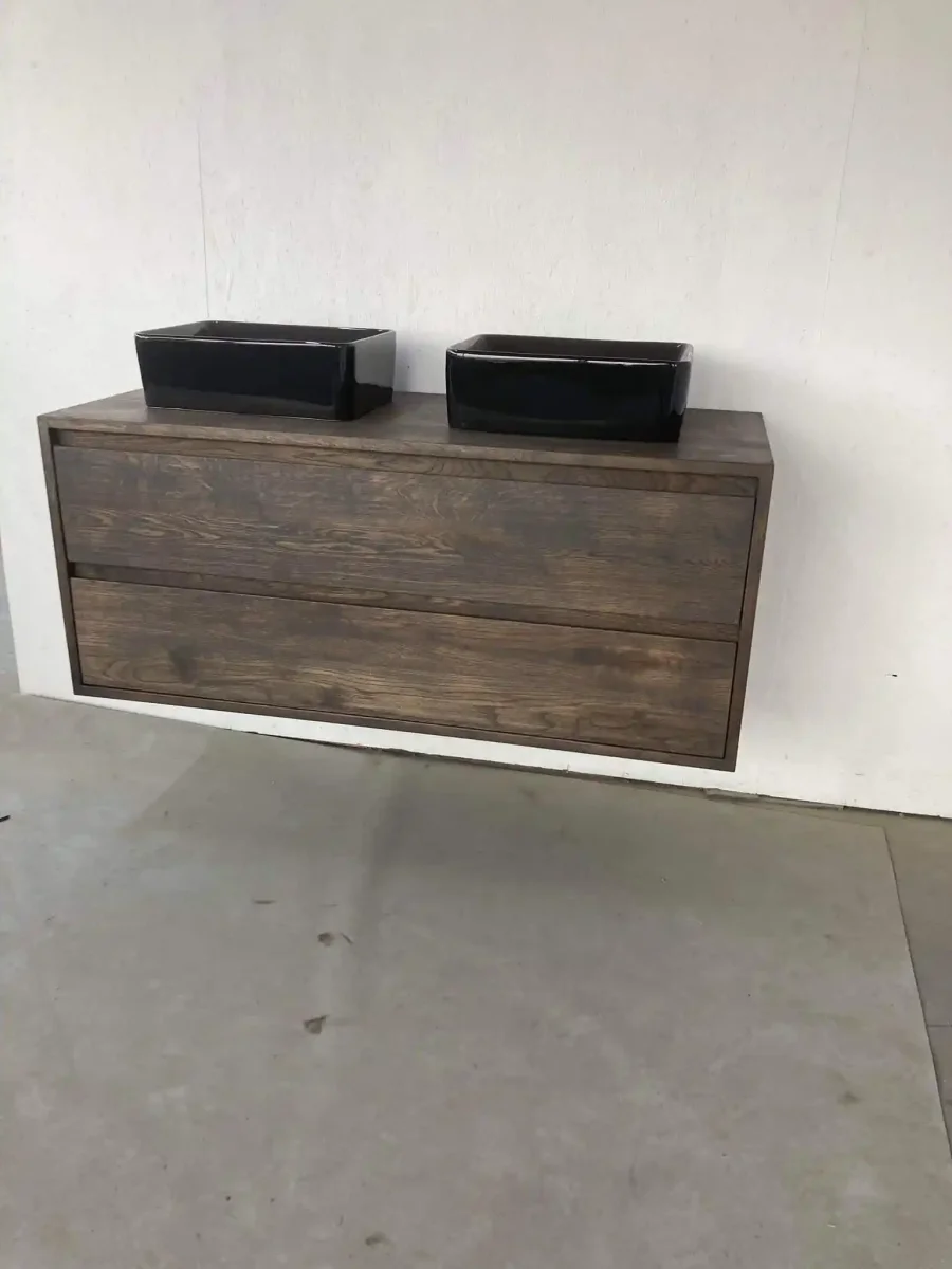 Dit badkamermeubel is massief van hoogwaardig 2 cm massief rustiek eikenhout. Standaard wordt het behandeld met 2K Skylt lak of een van de 40 verschillende kleuren olie van Rubio Monocoat, waardoor het perfect geschikt is voor gebruik in de badkamer en gemakkelijk schoon te houden. Het meubel is verkrijgbaar in diverse kleuren, waarbij dit specifieke exemplaar is behandeld met Monocoat Charcoal.