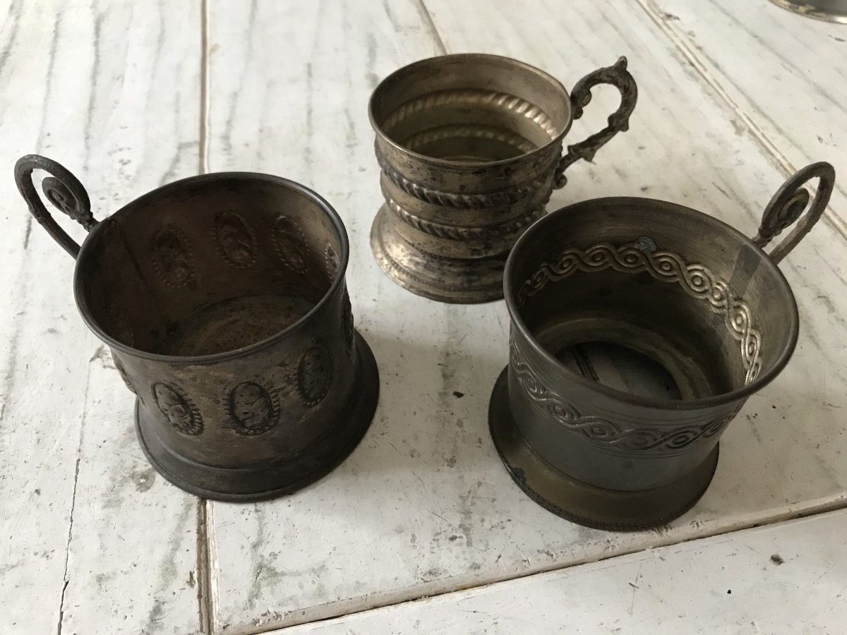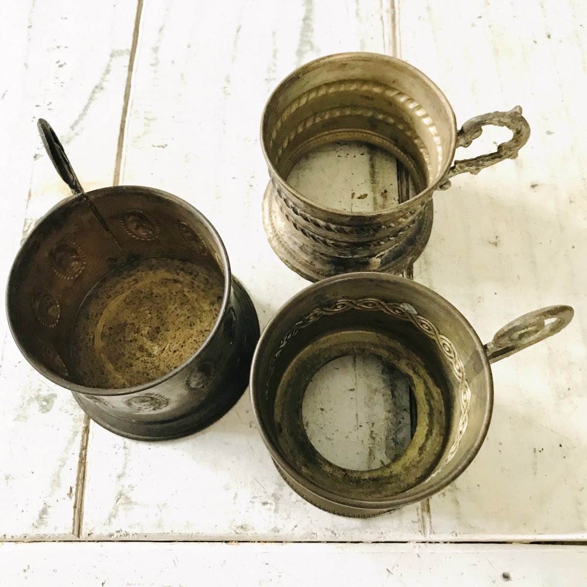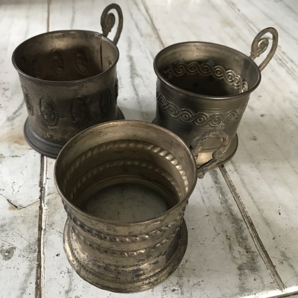 Oude koperen bekerhouders in drie verschillende uitvoeringen. Eén met dichte bodem.