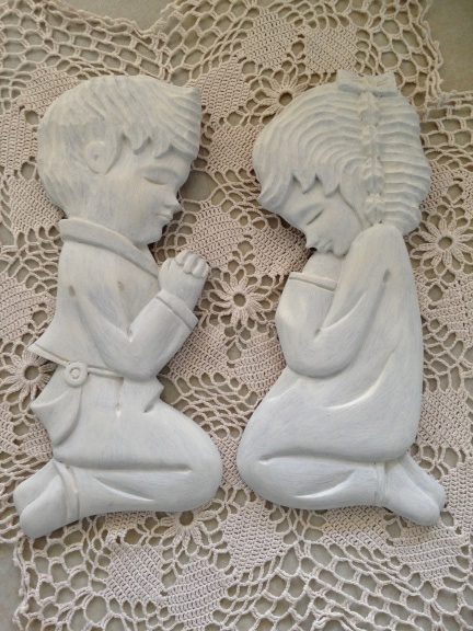 Mooi houten nostalgisch biddend stelletje…..Om op te hangen. Afm. 30 cm. hoog, en 13 cm. breed.