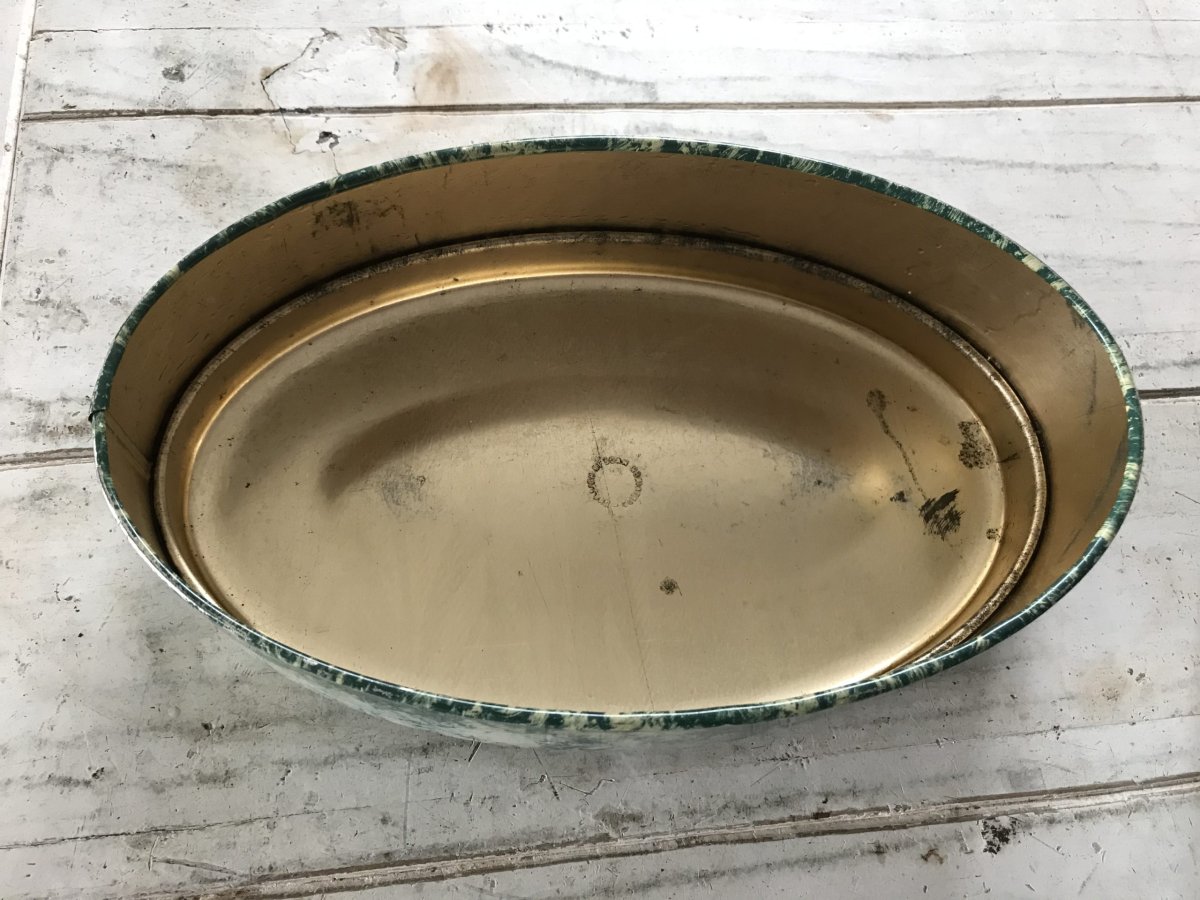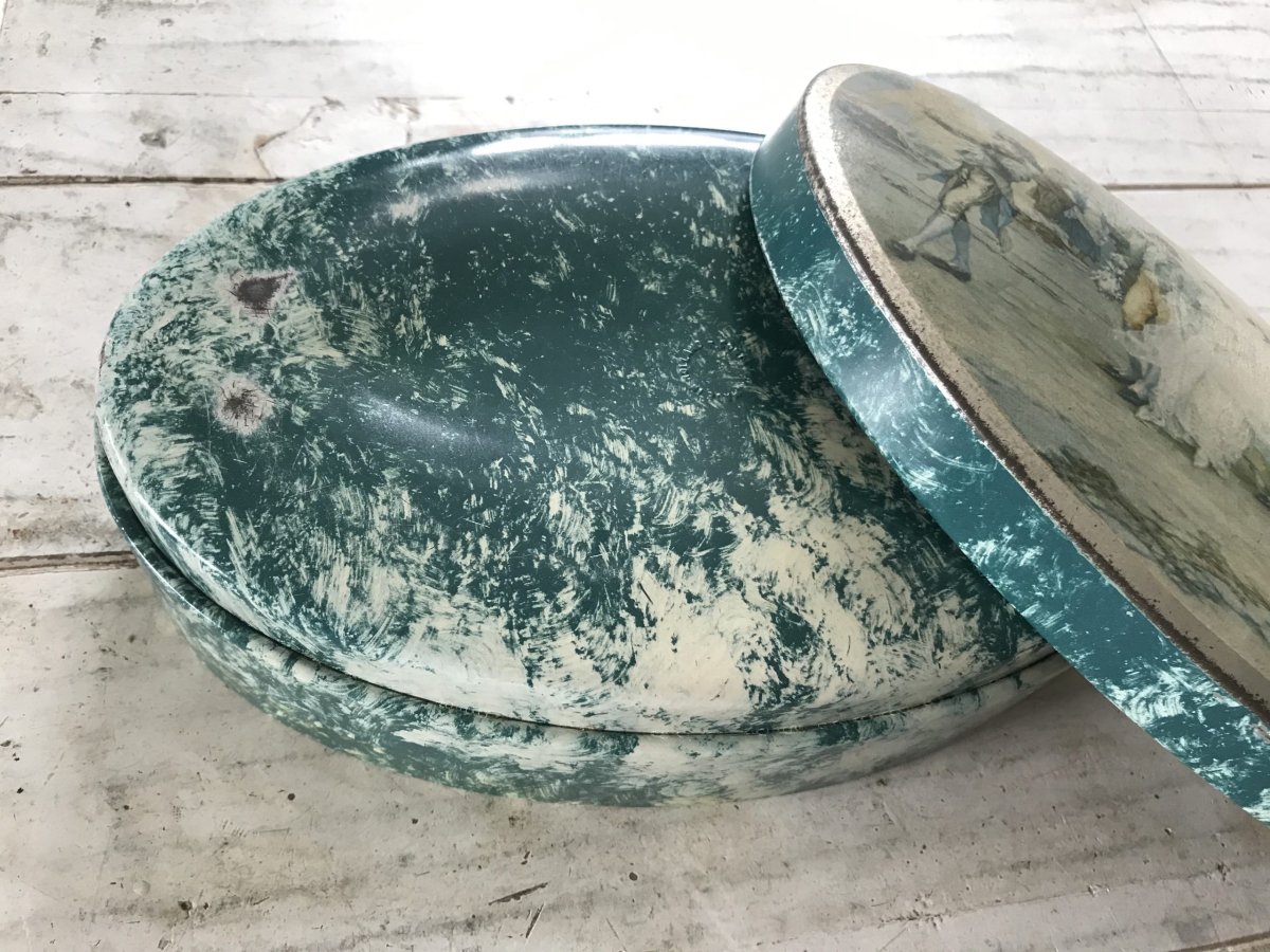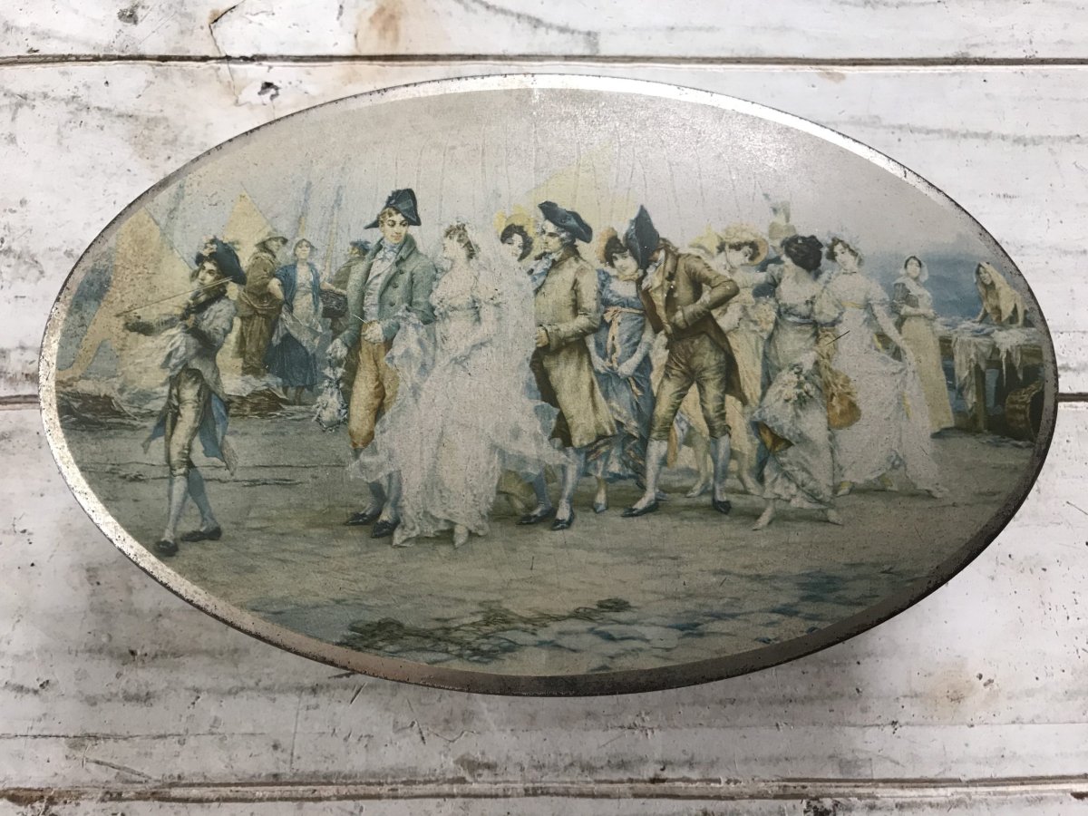 Oud groot blik in turquoise kleur met prachtige afbeelding van een een victoriaanse bruiloft.