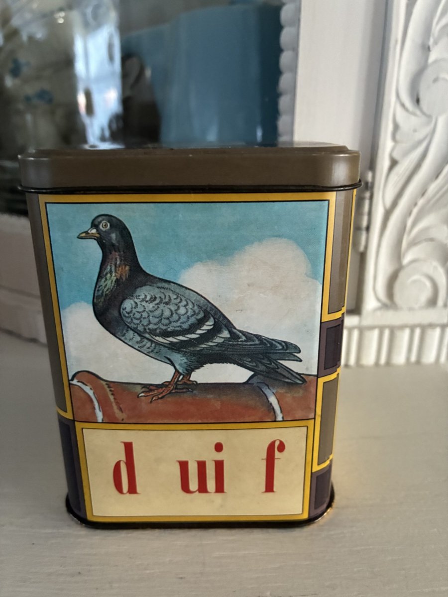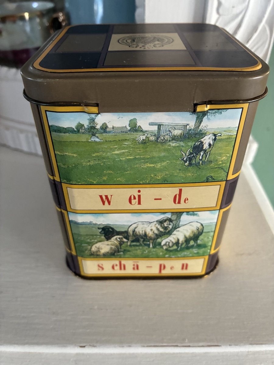Vintage sigaren blikje met nostalgische afbeeldingen.