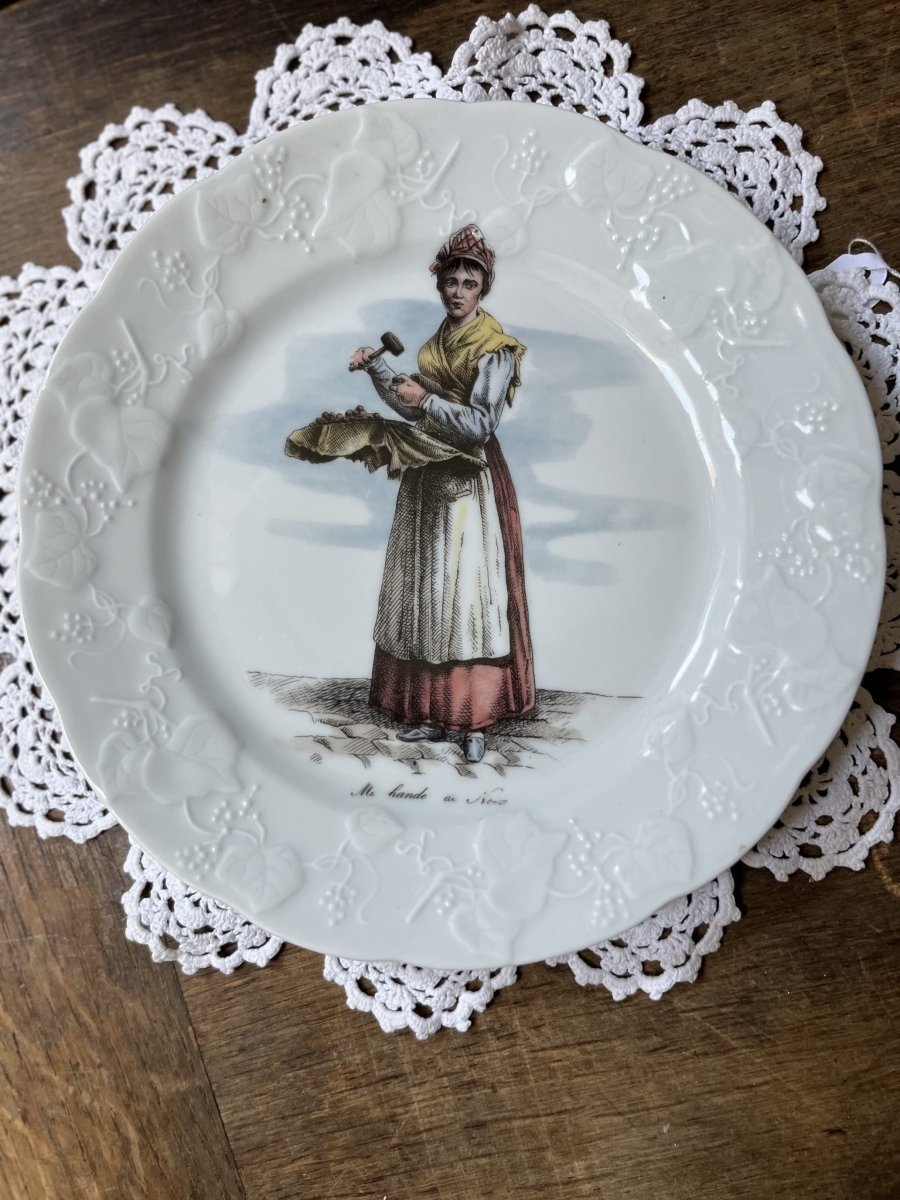 Twee franse borden met prachtige afbeeldingen van franse beroepen. Rand met druifjes afgewerkt. Setprijs.