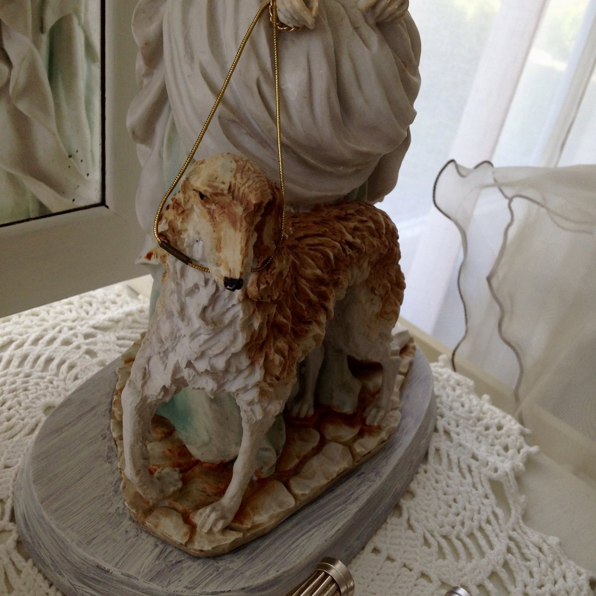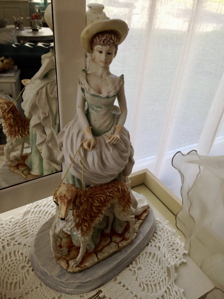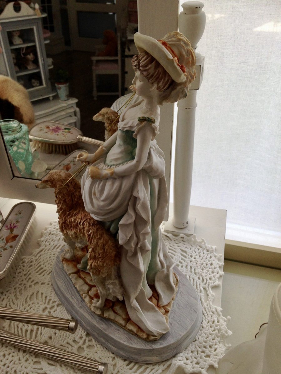 Prachtig beeldje van dame met hond op houten plaat. Prachtig tussen brocante spulletjes….