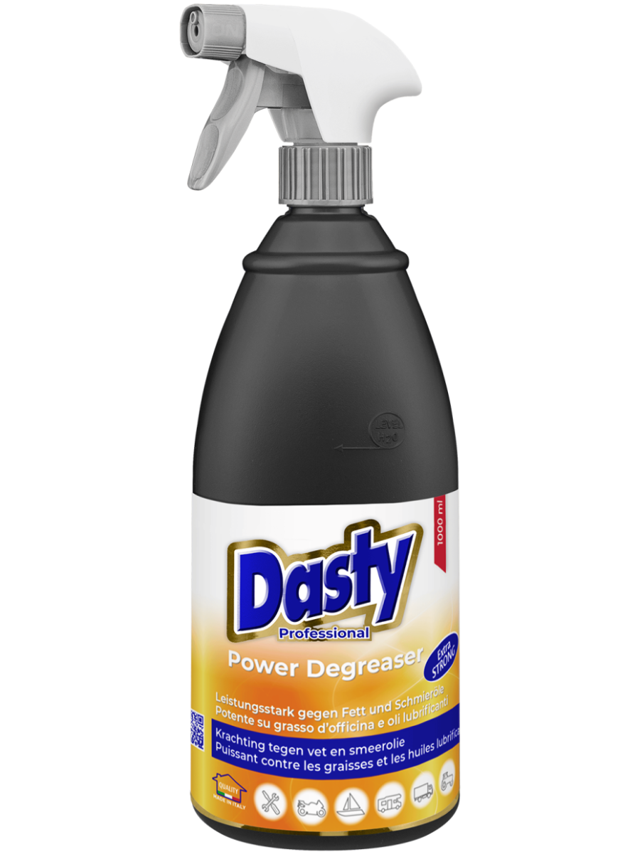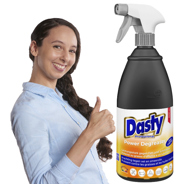 TOEPASSING: Spray Dasty Ontvetter Professional op het oppervlak, laat max. 3 min. inwerken, spoel daarna af. Voor mechanische onderdelen: week max. 10 min. in een mengsel van ontvetter en water, spoel af.
