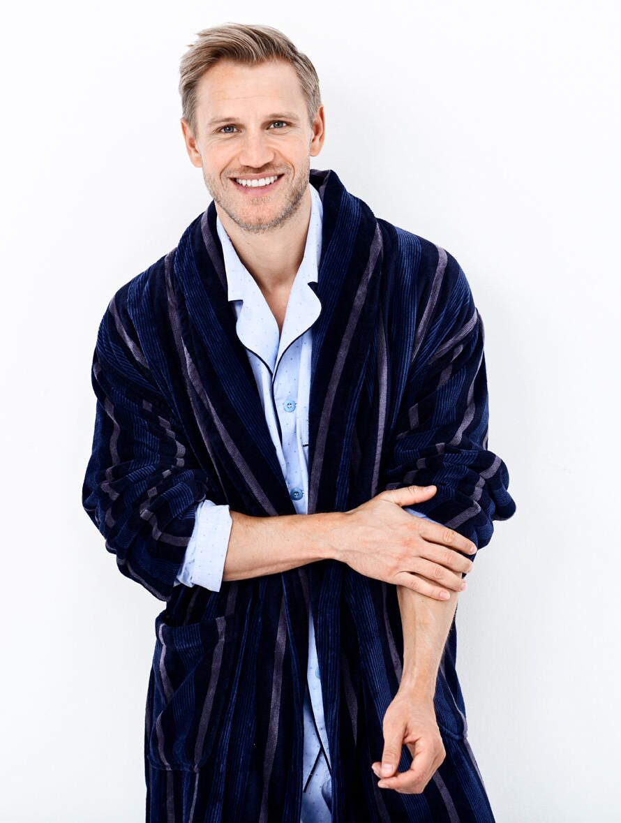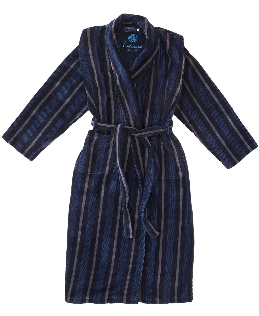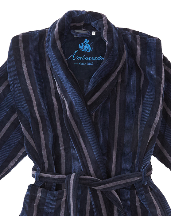 Donkerblauw met grijs gestreepte herenbadjas van velours badstof, donkerblauw streeppatroon van smalle en wat bredere streepjes. Veloursbadstof: de binnenkant badstof, aan de buitenkant geschoren. Van 100 % katoen, dus ook als badjas te gebruiken. Ruimvallende herenmaten met lange mouwen, in de maten S, M, L, XL, XXL, en 3XL. De lengte is afhankelijk van de maat ca. 125-140 cm.