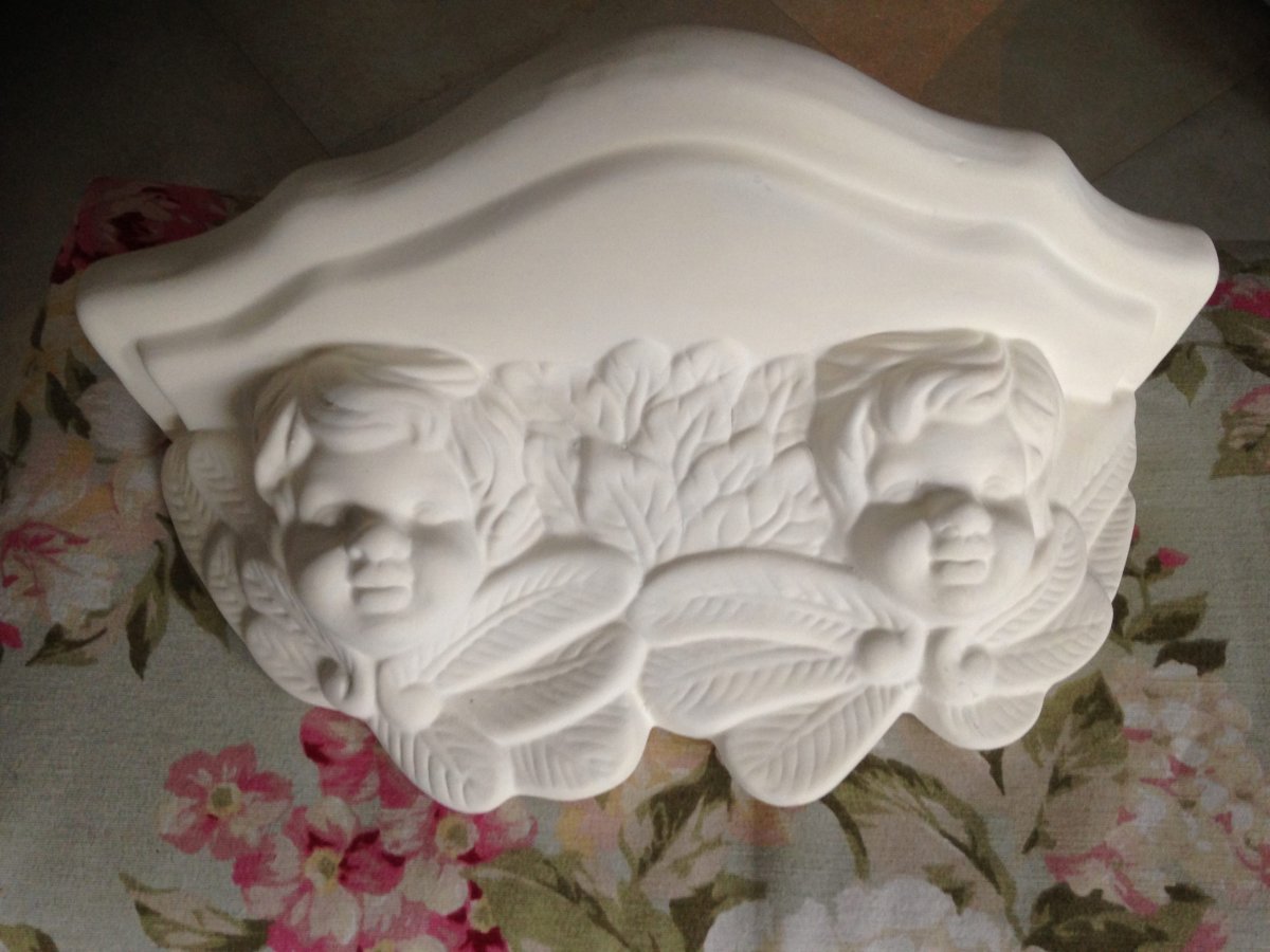 Engelenconsole van steen in matte teint. Leuk om op te hangen en er leuke spulletjes op te plaatsen, maar je kunt haar ook ergens neerleggen.