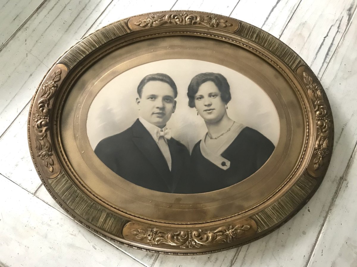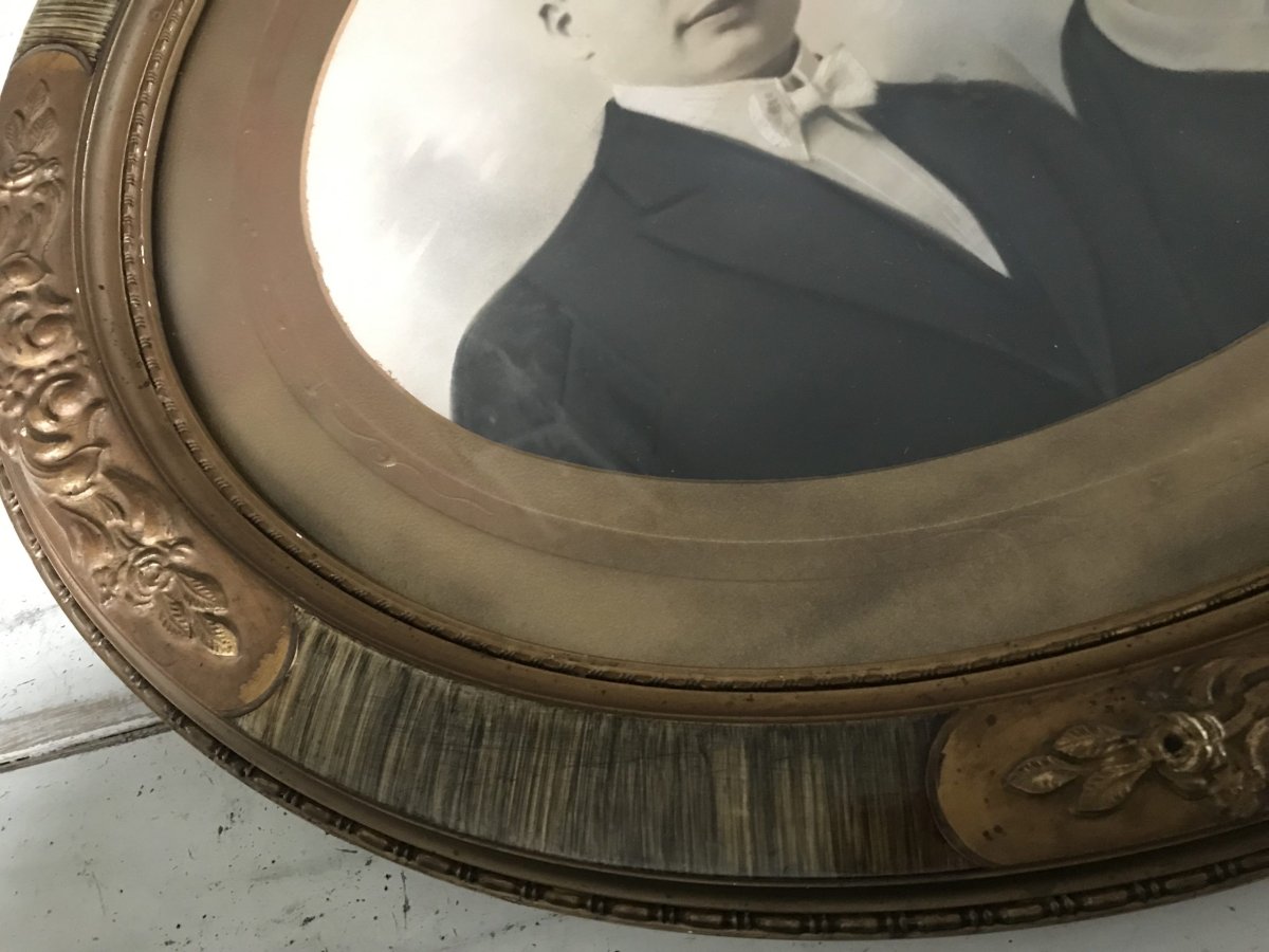 Prachtige bewerkte ovalen fotolijst met heel mooi paspartout en oude foto.