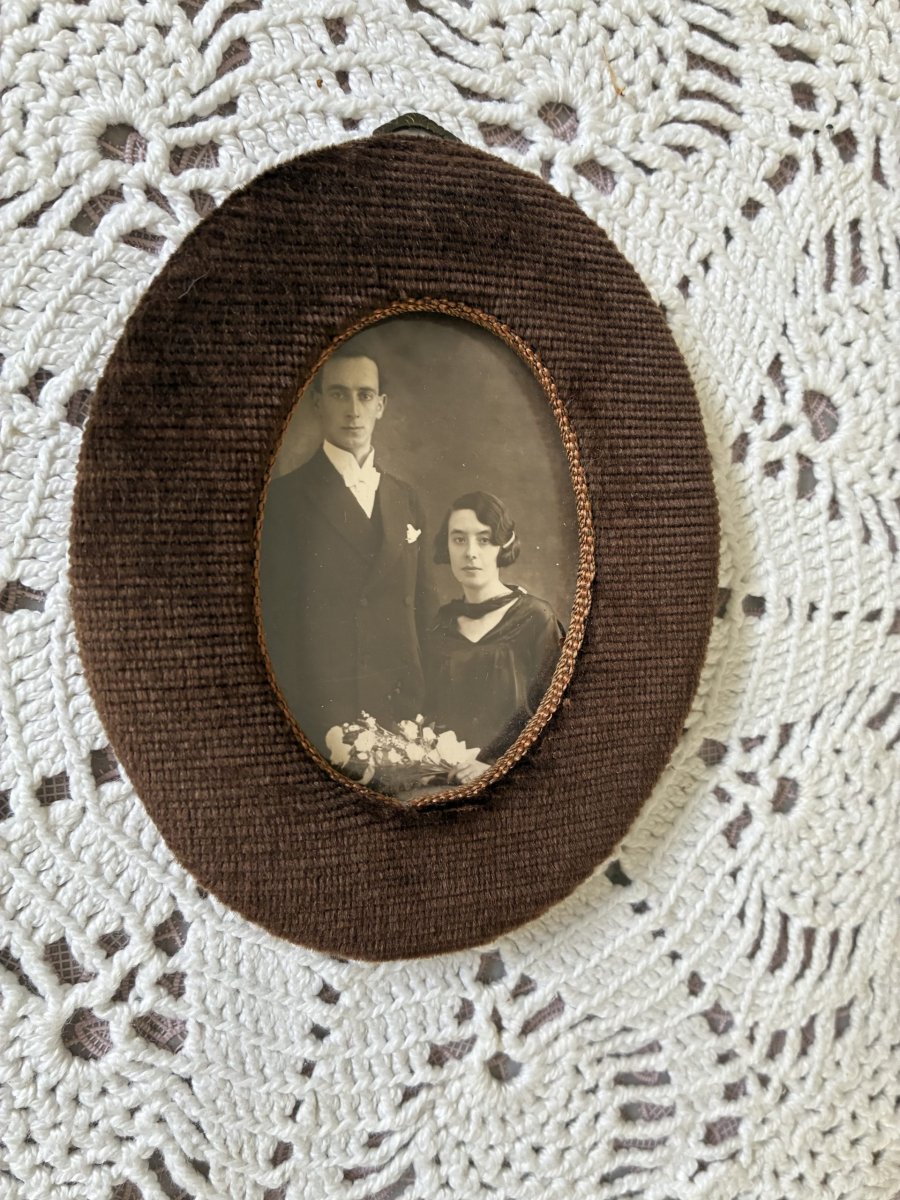 Klein ovaal fotolijstje met een okergeel zijde beklede achterkant.Klein haakje aan de onderkant om nog iets aan te kunnen hangen. Met ophang-oogje.