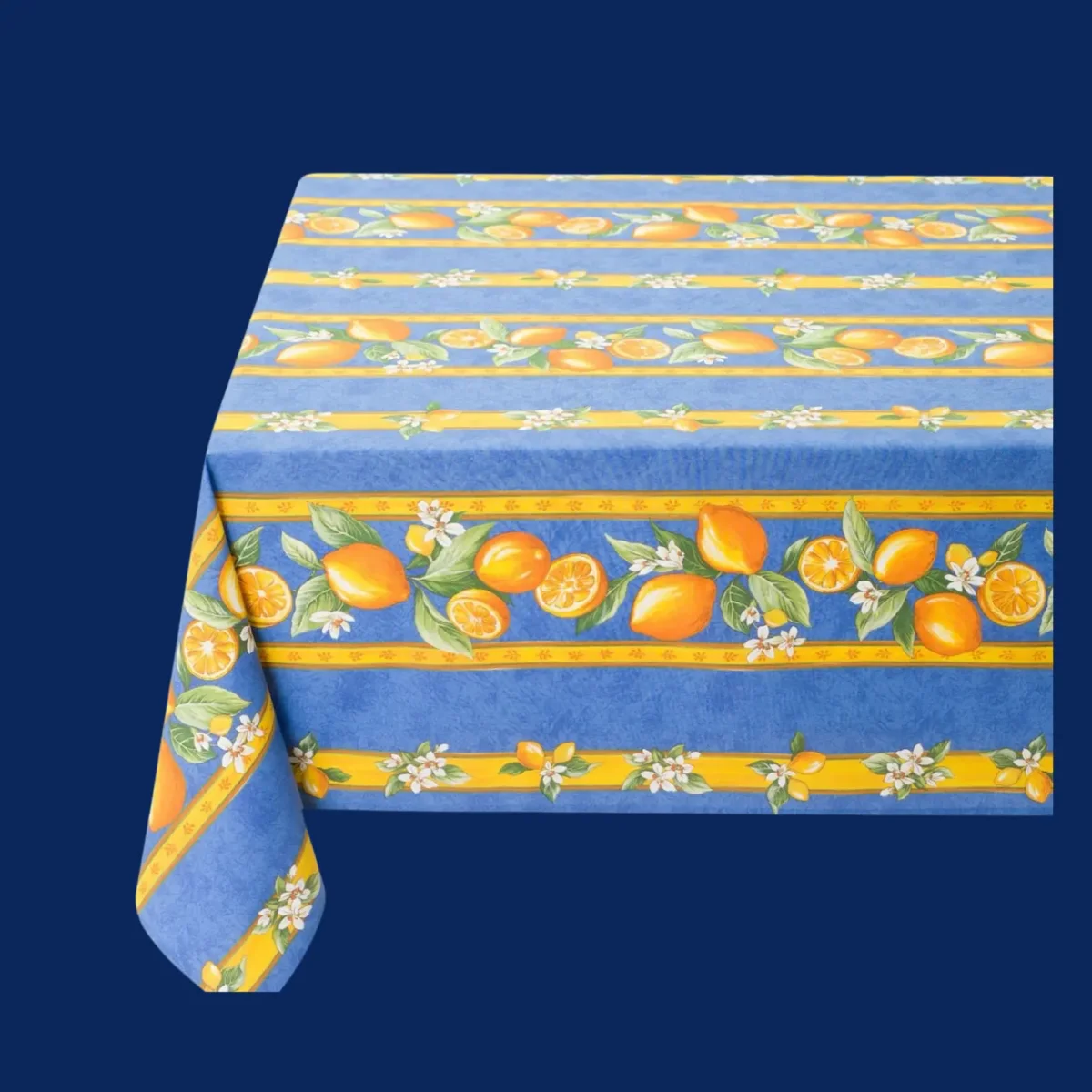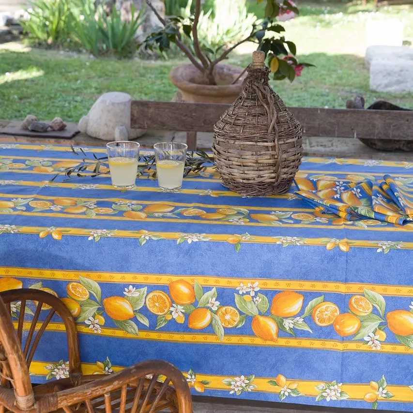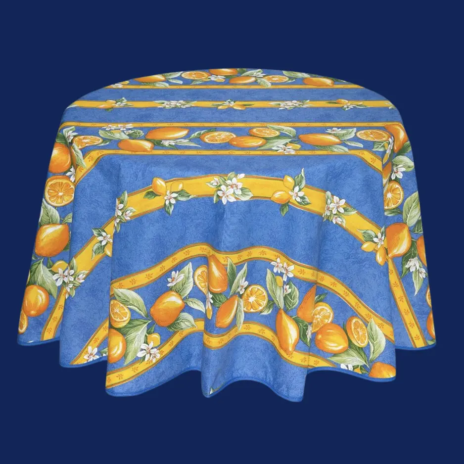 U kunt het Franse tafelkleed Citroentjes uit Menton blauw bestellen in de maten 150×200, 150×250, 150×300 en 150×350 cm. en 150 cm. rond.