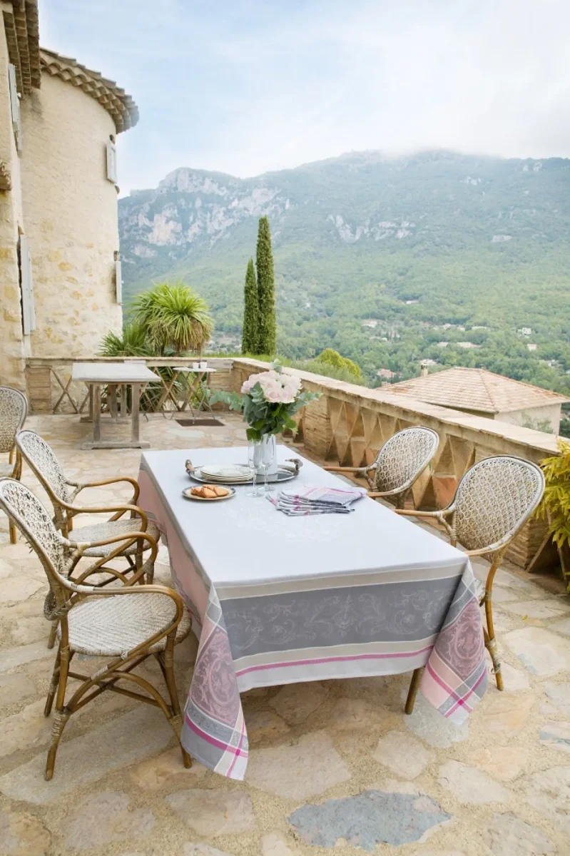 Frans tafelkleed Jacquard Cheverny gris rose kunt bestellen in de maat 160×250 cm.