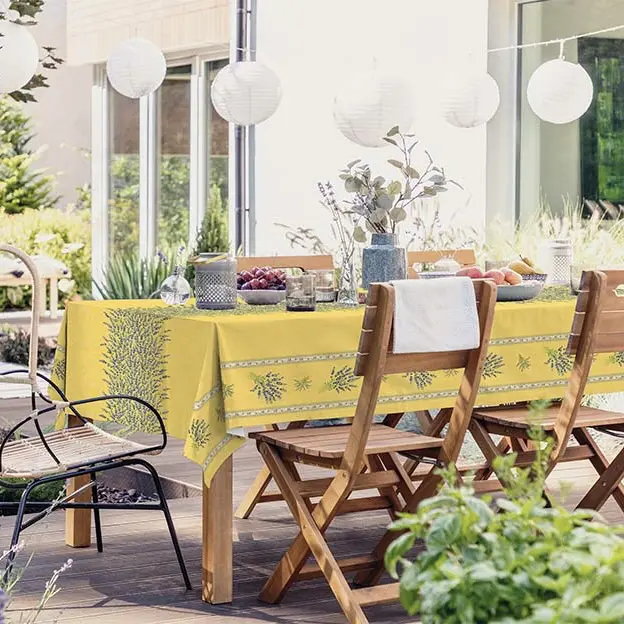 Dit Franse is tafelkleed kunt u binnen en buiten in de tuin of op het terras te gebruiken. Bovendien is dit tafelkleed te bestellen met of zonder coating.