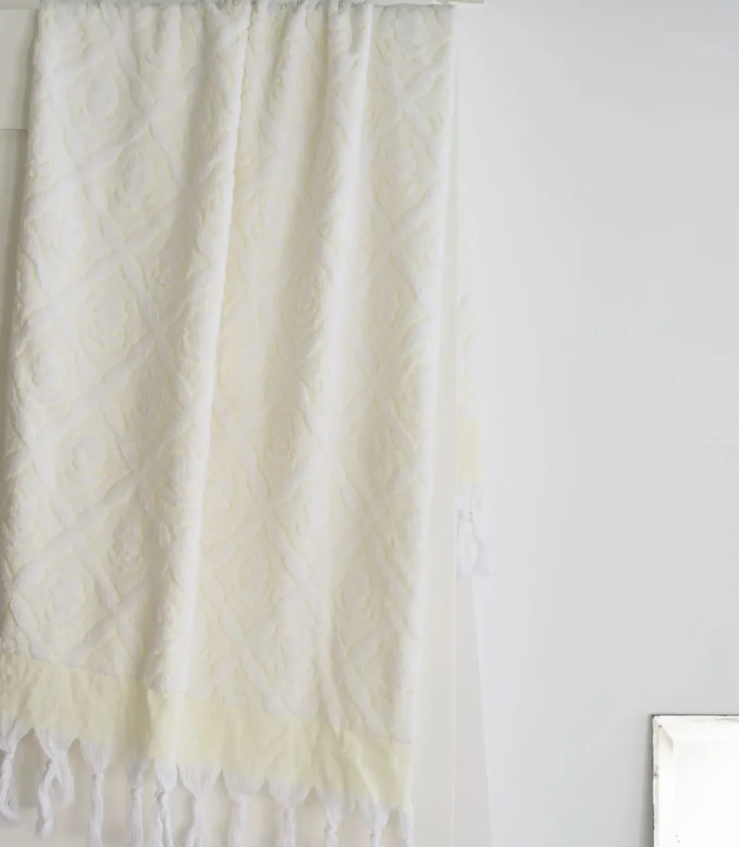 Het subtiel ingeweven bloempatroon en de handgeknoopte franje geven de handdoek een mooie uitstraling.