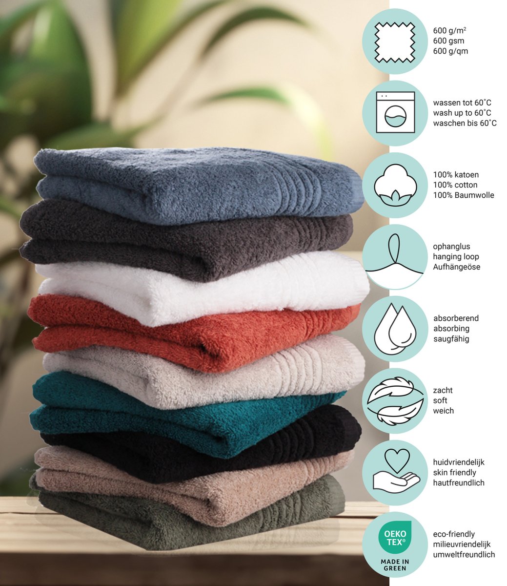 Verwen jezelf met deze luxe Supreme Handdoekenset, bestaande uit maar liefst 22 onderdelen in een tijdloos wit. Deze set is de perfecte aanvulling voor elke badkamer en biedt ultiem comfort en absorptievermogen dankzij het zachte, 100% katoen. Met een indrukwekkende dichtheid van 600 g/m² voelen deze handdoeken heerlijk dik en zacht aan op je huid, wat zorgt voor een spa-ervaring in je eigen huis. De OEKO-TEX Made in Green certificering garandeert dat de handdoeken op een verantwoorde en milieuvriendelijke manier zijn geproduceerd, zodat je met een gerust hart kunt genieten van pure kwaliteit. Deze uitgebreide set bevat alles wat je nodig hebt: 4 grote badhanddoeken (70x140cm), 6 handdoeken (50x100cm), 6 gastendoekjes (30x50cm) en 6 waslapjes (16x21cm). Of je nu na een verkwikkende douche wilt afdrogen, je handen wilt wassen of een zachte reiniging zoekt, er is altijd een geschikte handdoek bij de hand. Het pure katoen is niet alleen zacht, maar ook duurzaam en gemakkelijk te onderhouden. Volg de wasvoorschriften door te wassen op 60°C en te drogen op lage temperatuur om de kwaliteit en zachtheid van je handdoeken optimaal te behouden.