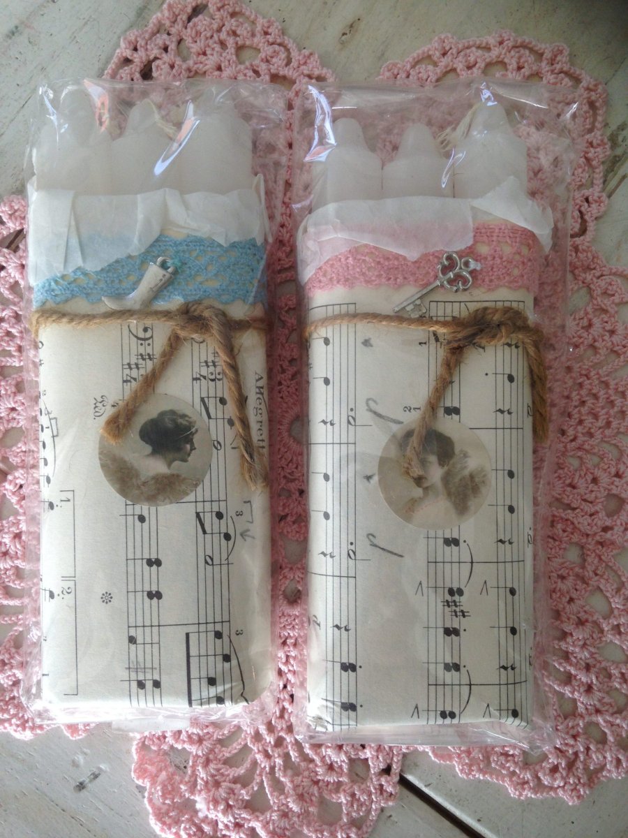 Pakketje kaarsjes in muziekpapier met kant en bedeltje.