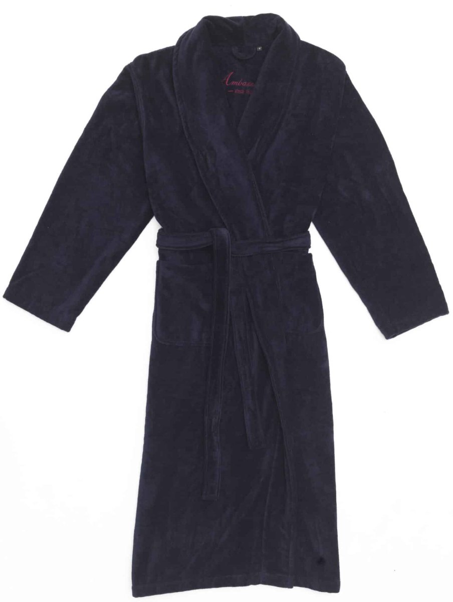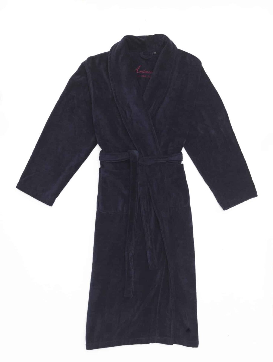 Donkerblauwe herenbadjas van biologische katoen (100 % organic). Een elegante badjas of kamerjas met sjaalkraag, van luxe velours badstof in een diep donkerblauwe kleur. Het is een warme kamerjas om thuis te dragen, voor heren, maar ook voor dames, de maten gaan vanaf maat S tot en met 6XL! De kleinste maat valt vrij kort (ca. 112 cm.), maar in de grotere maten valt dit model badjas juist langer dan de meeste badjassen. Ook de mouwen vallen lang, daarom zijn deze badjassen vanaf maat L ook zeker geschikt voor heren van twee meter. We kunnen u telefonisch of per mail meer informatie geven over de pasvorm en de maten van deze badjassen van Ambassador.