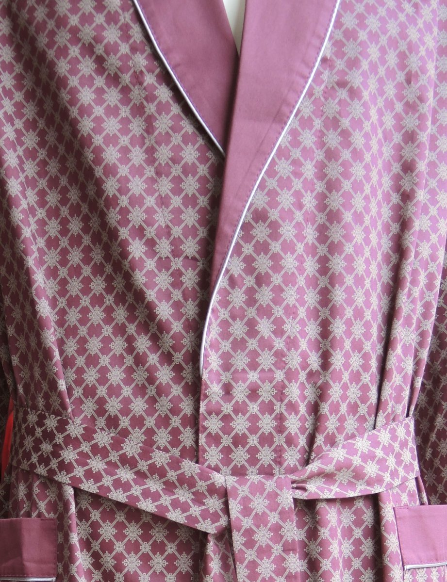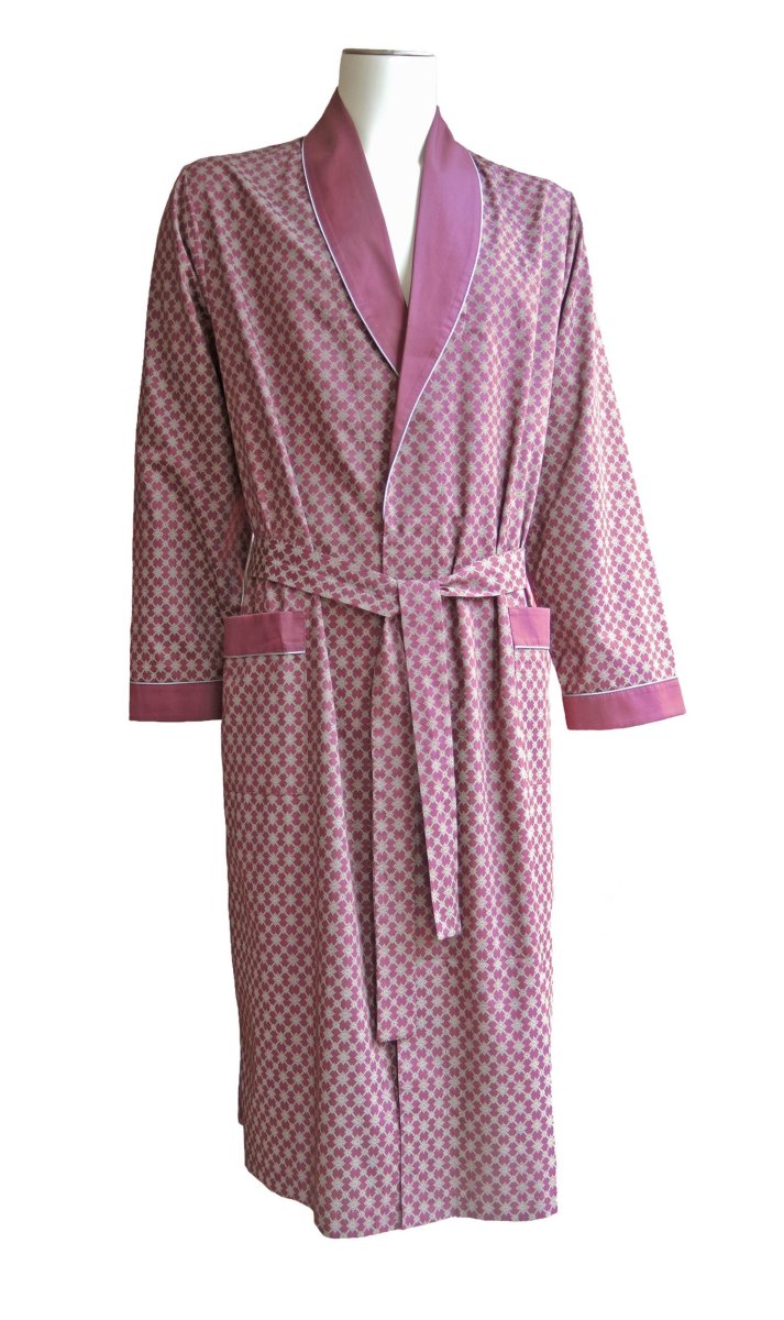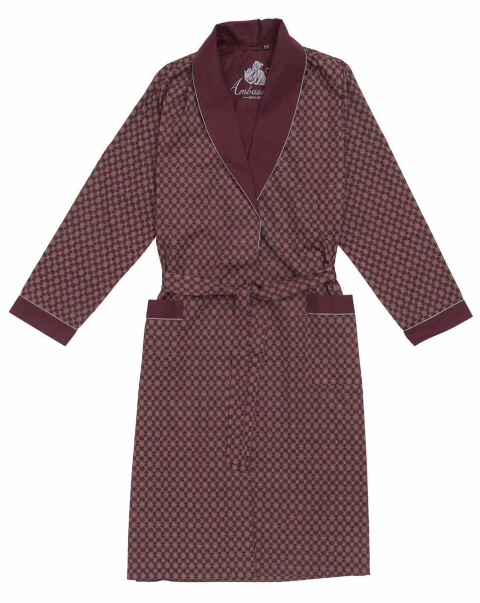 Luxe dunne kamerjas van satijnkatoen (100% katoen) met klassiek zilvergrijs motief en effen donkerrode sjaalkraag. Fijne herenochtendjas voor thuis en vanwege het gewicht ook handig om mee te nemen op reis. Deze herenkamerjas hebben we in extra grote maten en in kleine maten. Echt een mooi verjaardagscadeau, of luxe kado voor Kerst voor een man.