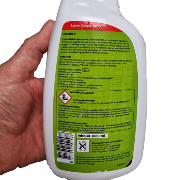 Veiligheidsinformatie: Deltamethrin kan irriterend zijn voor de huid en ogen. Draag altijd handschoenen en beschermende kleding bij gebruik van de spray en vermijd contact met de ogen. Houd buiten bereik van kinderen en huisdieren.