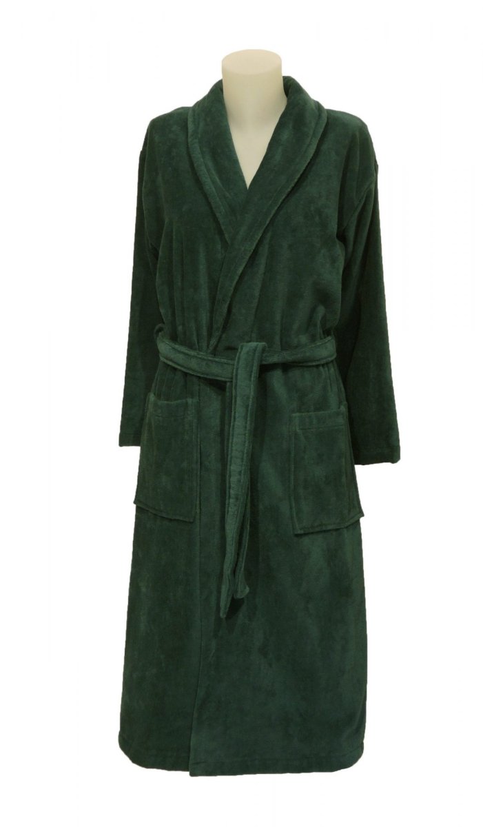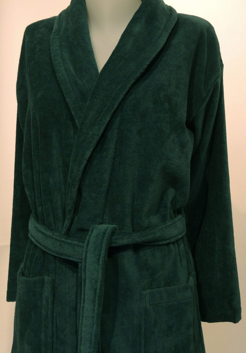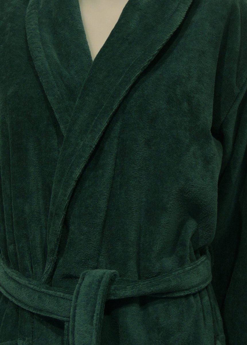 Ochtendjas, kamerjas of badjas in donkergroene tint (groenblauw), met luxe kraag, van zachte velours badstof, van 100% katoen. De badstof is goed absorberend en dus is deze badjas ook geschikt voor de sauna De buitenkant is geschoren badstof, zodoende is de badjas toch warm, en niet zwaar. In alle maten ruime overslag, met slanke mouwen, wat het een elegante badjas maakt.