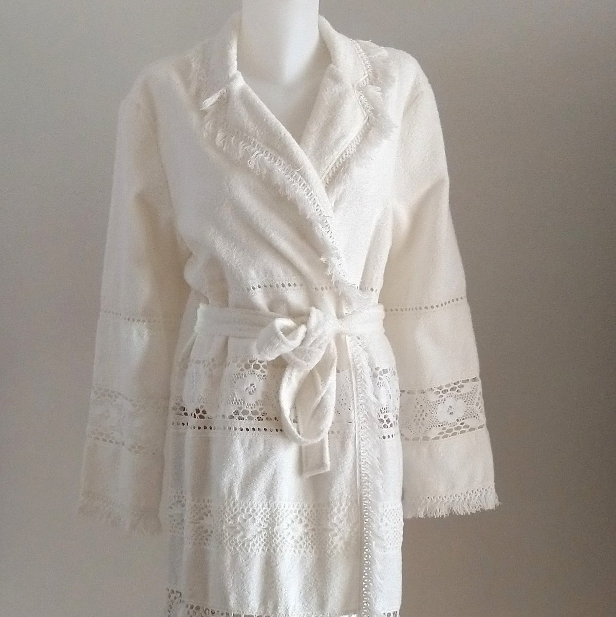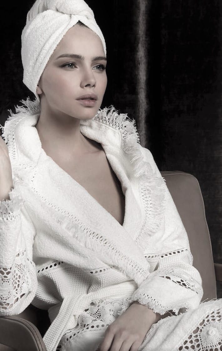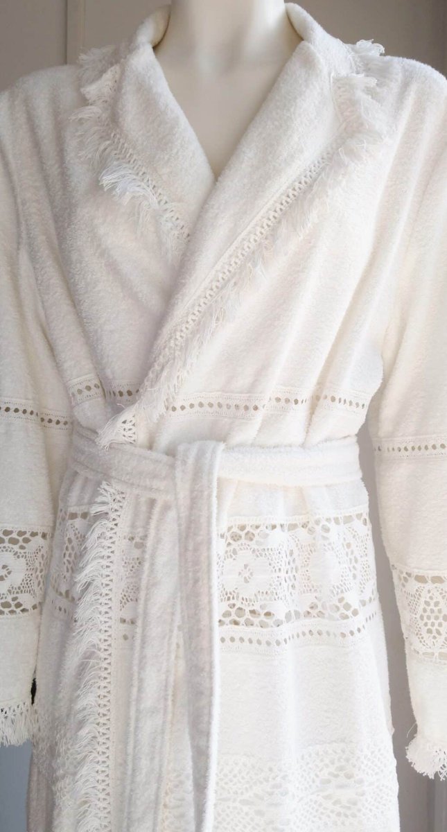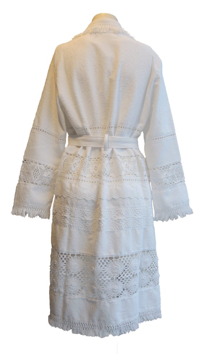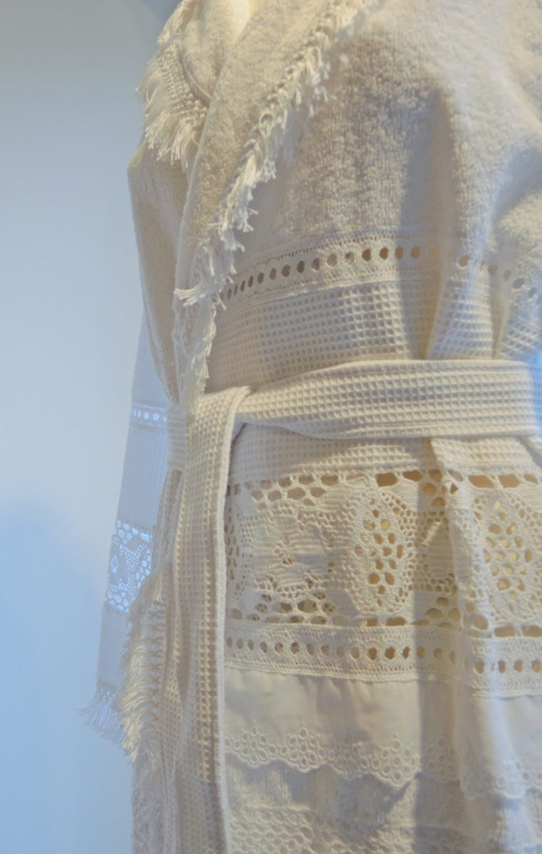 Designbadjas van Luna di Giorno, van verschillende stoffen: opengewerkt kant, wafelkatoen en badstof, met franje langs de kraag en de mouwen. Echt een mooi cadeau voor je vriendin, dochter, vrouw, moeder, zus, … of een cadeau voor jezelf natuurlijk!