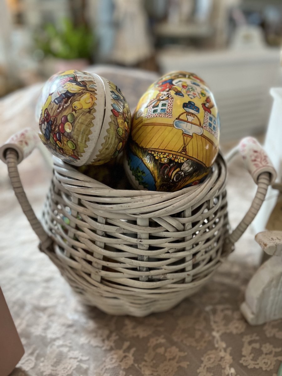 Mooie grote rieten mand met porseleinen handvatten.