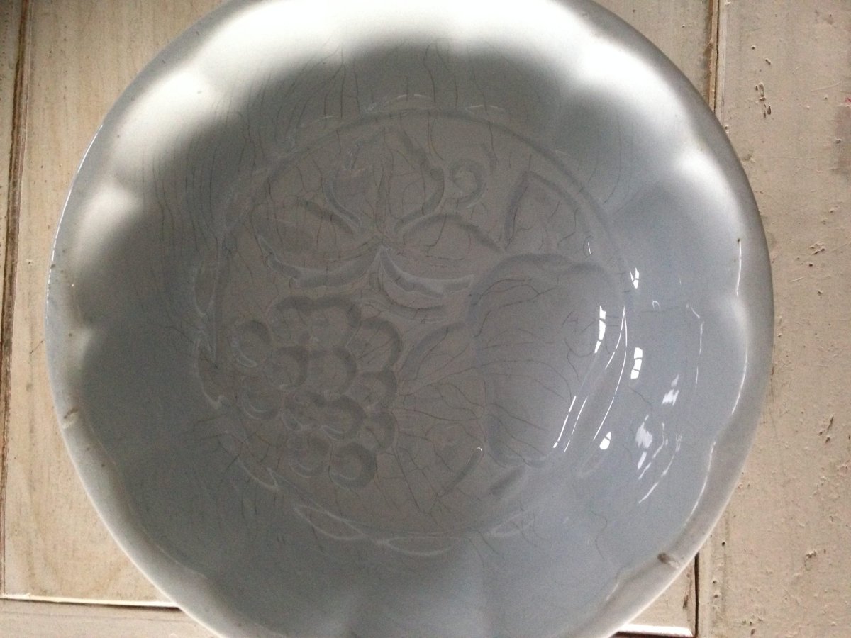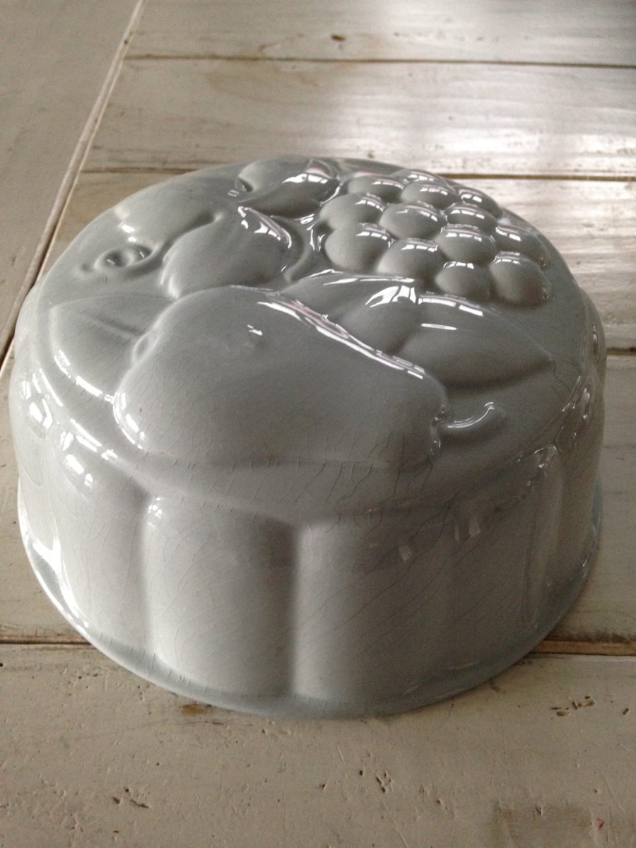 Lichtblauwe prachtig vormgegeven puddingvorm. Is een oude dus binnenkant vertoont wat haarscheurtjes, maar het is een schatje!