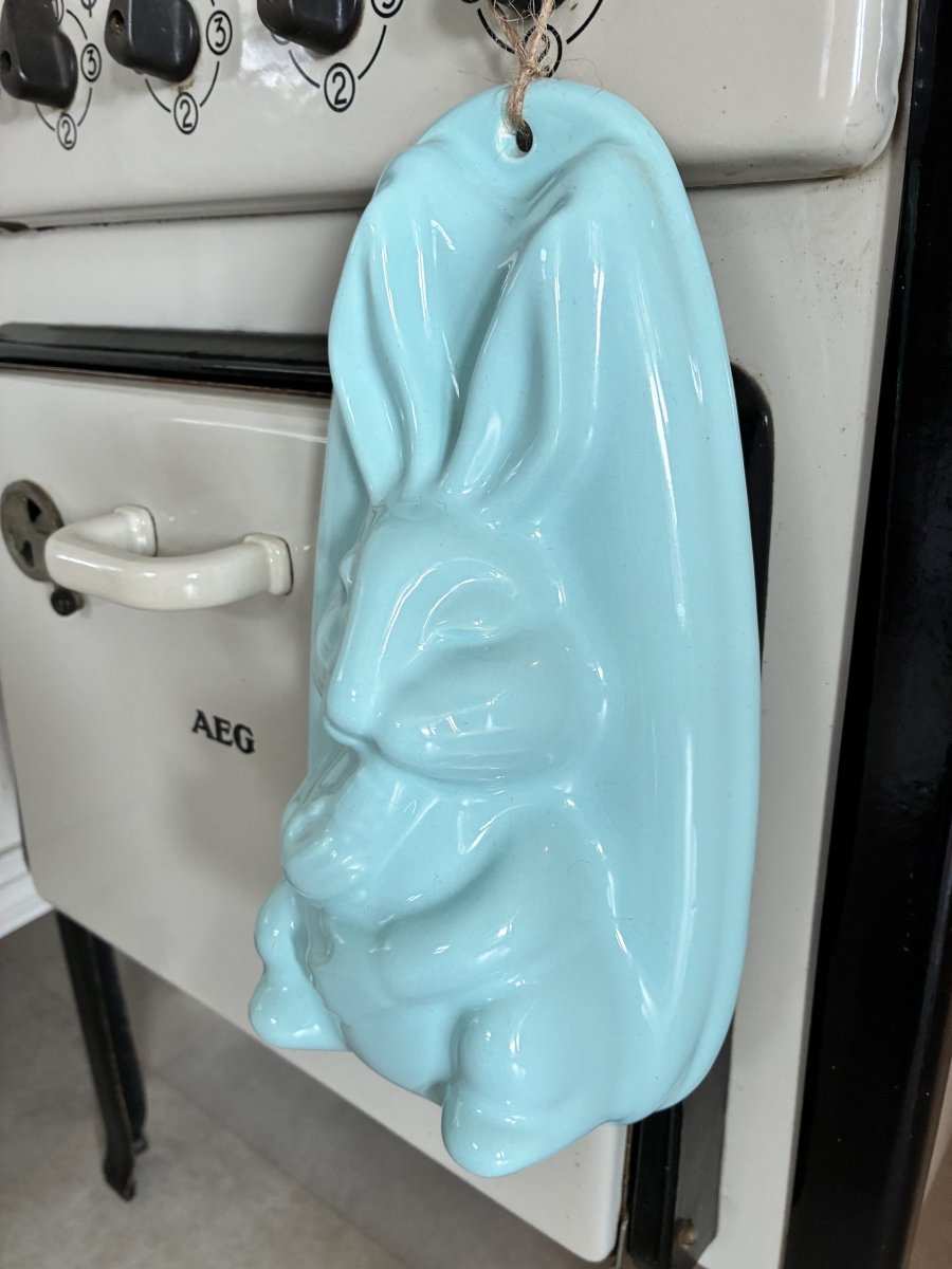 Vintage keramieken puddingvorm in vorm van een paashaas. Prachtige mintgroene kleur.