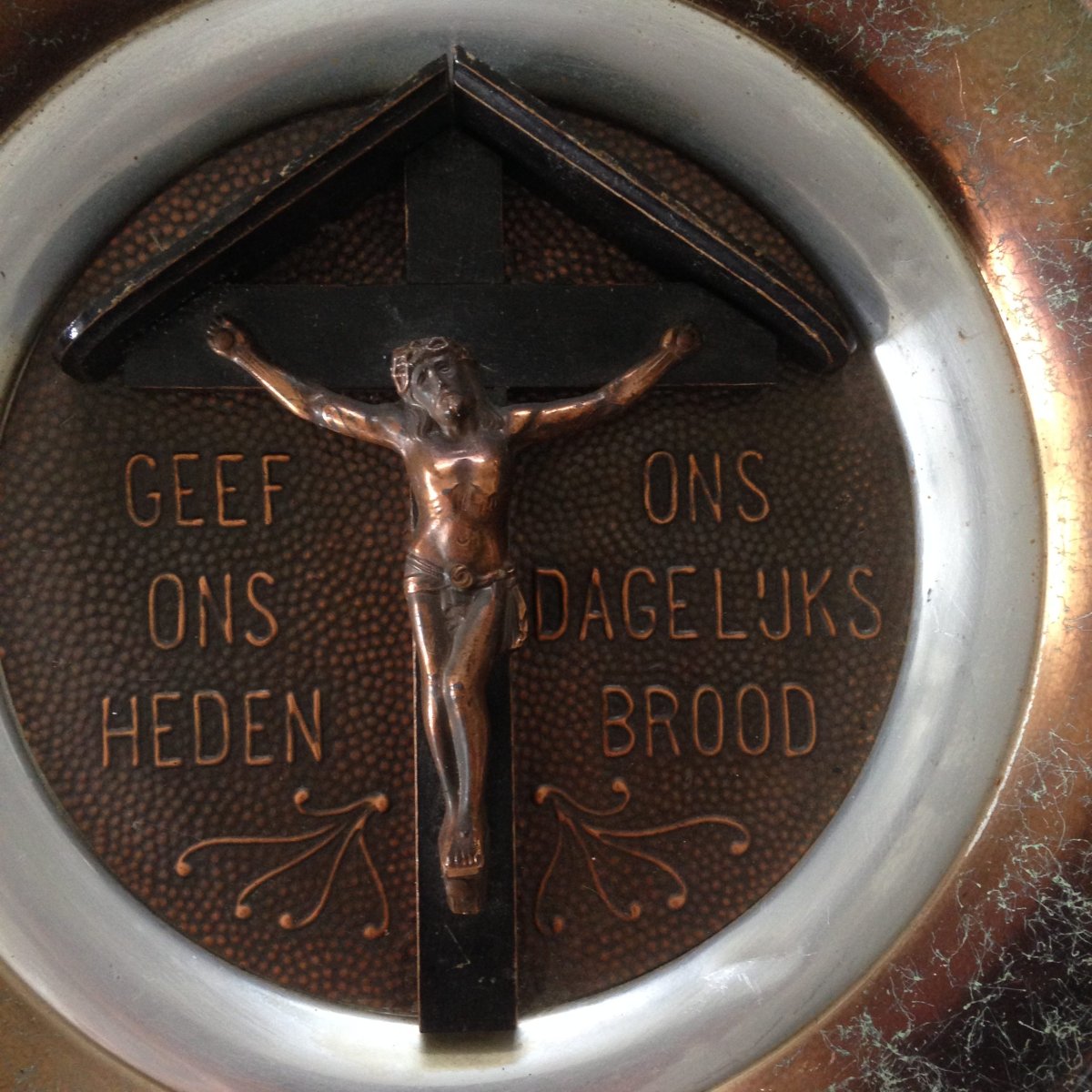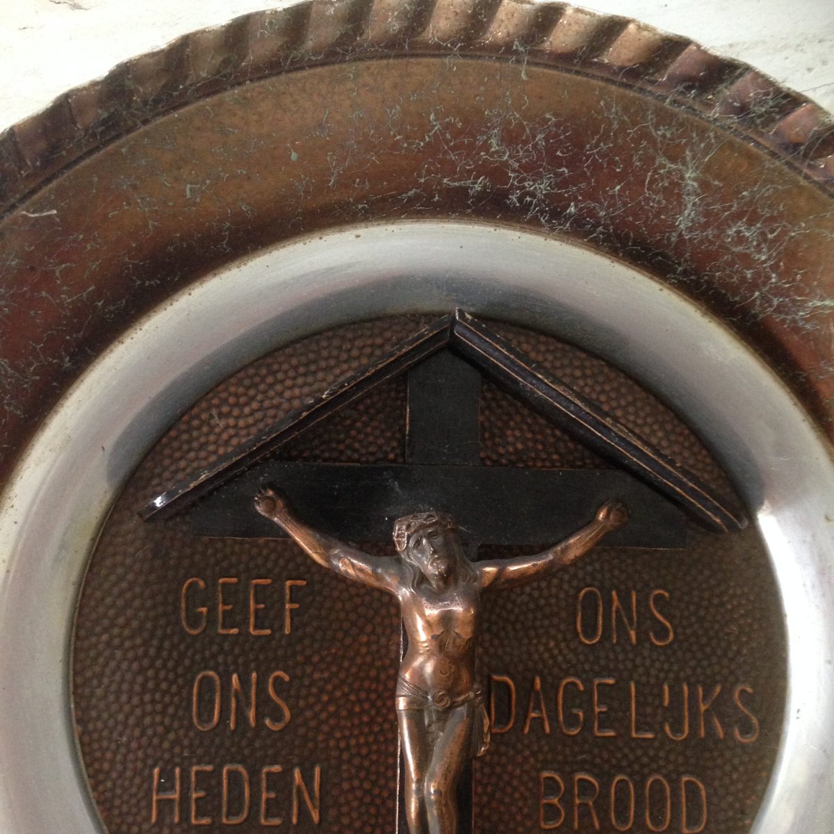 Mooi oud wandbord met religieuze tekst en kruis met Jezus.