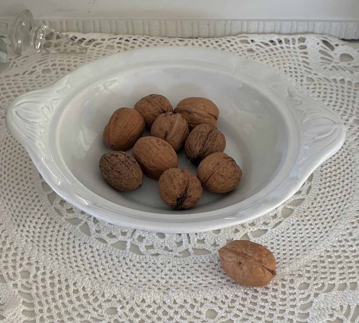 Brocante witte schaal om fruit of dennenappels te presenteren.
