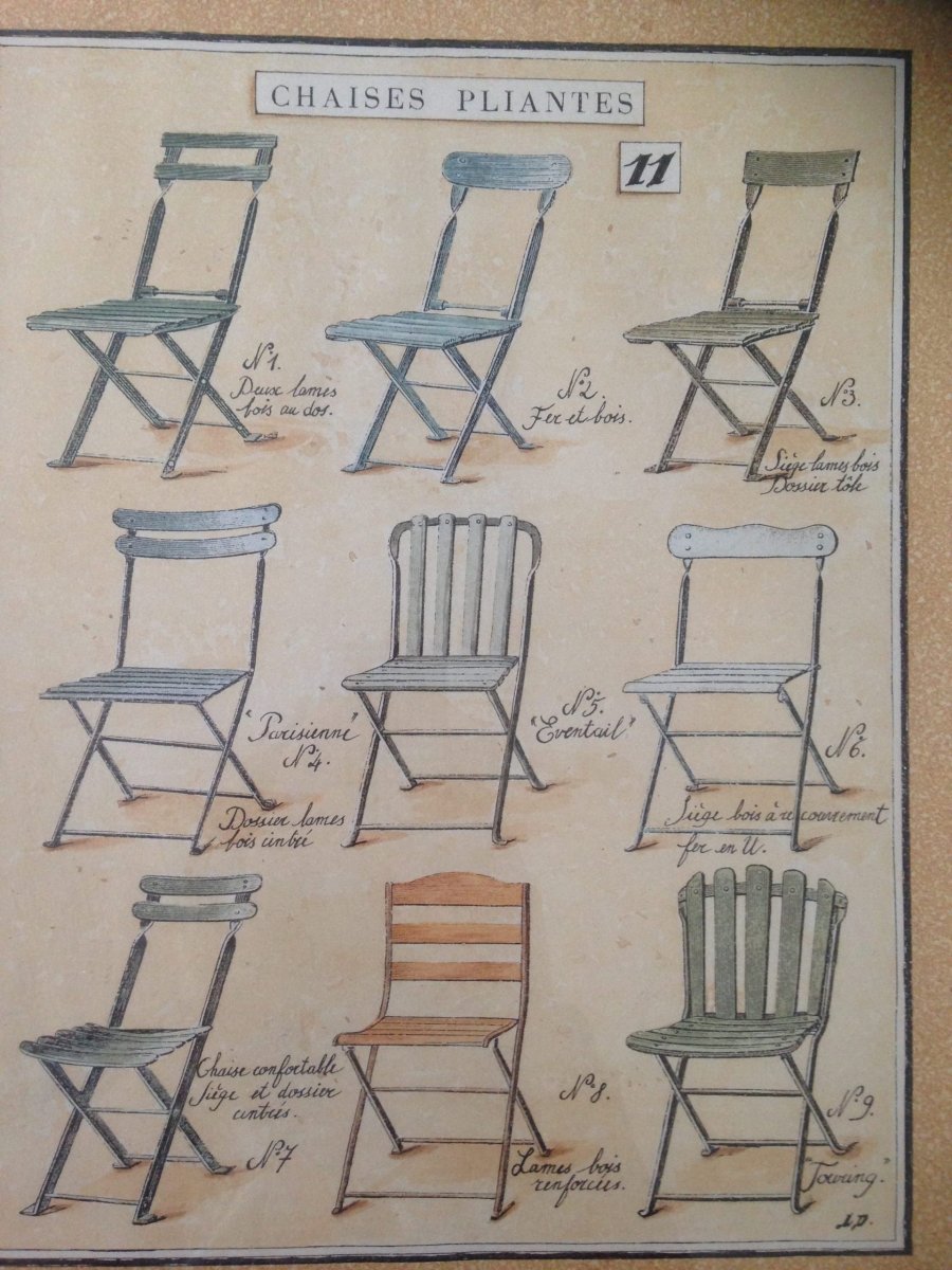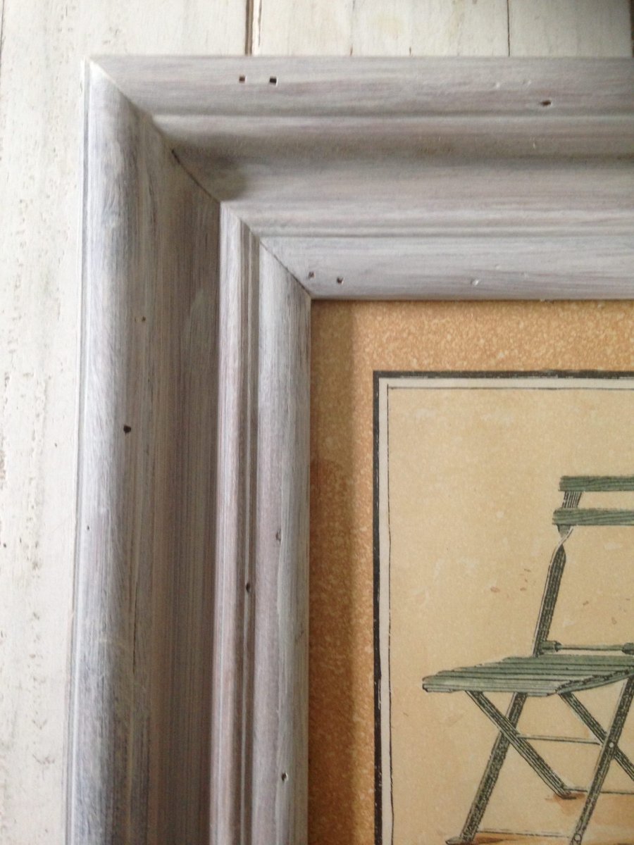 Mooie brocante houten lijst met afbeelding van Franse tuinstoeltjes. Prachtig in een serre of tuinkamer!