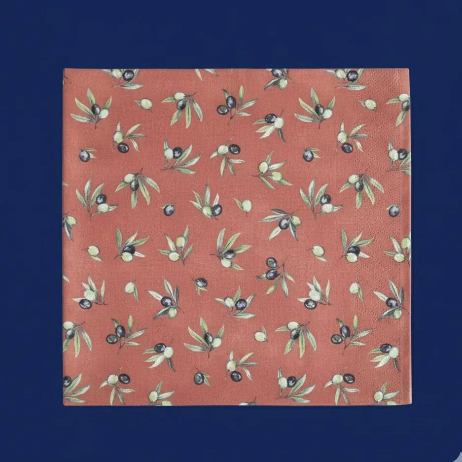 Servet Oliviers terra, een Franse servet met kleine olijftakjes. Deze servet past het terra tafelkleed Oliviers.