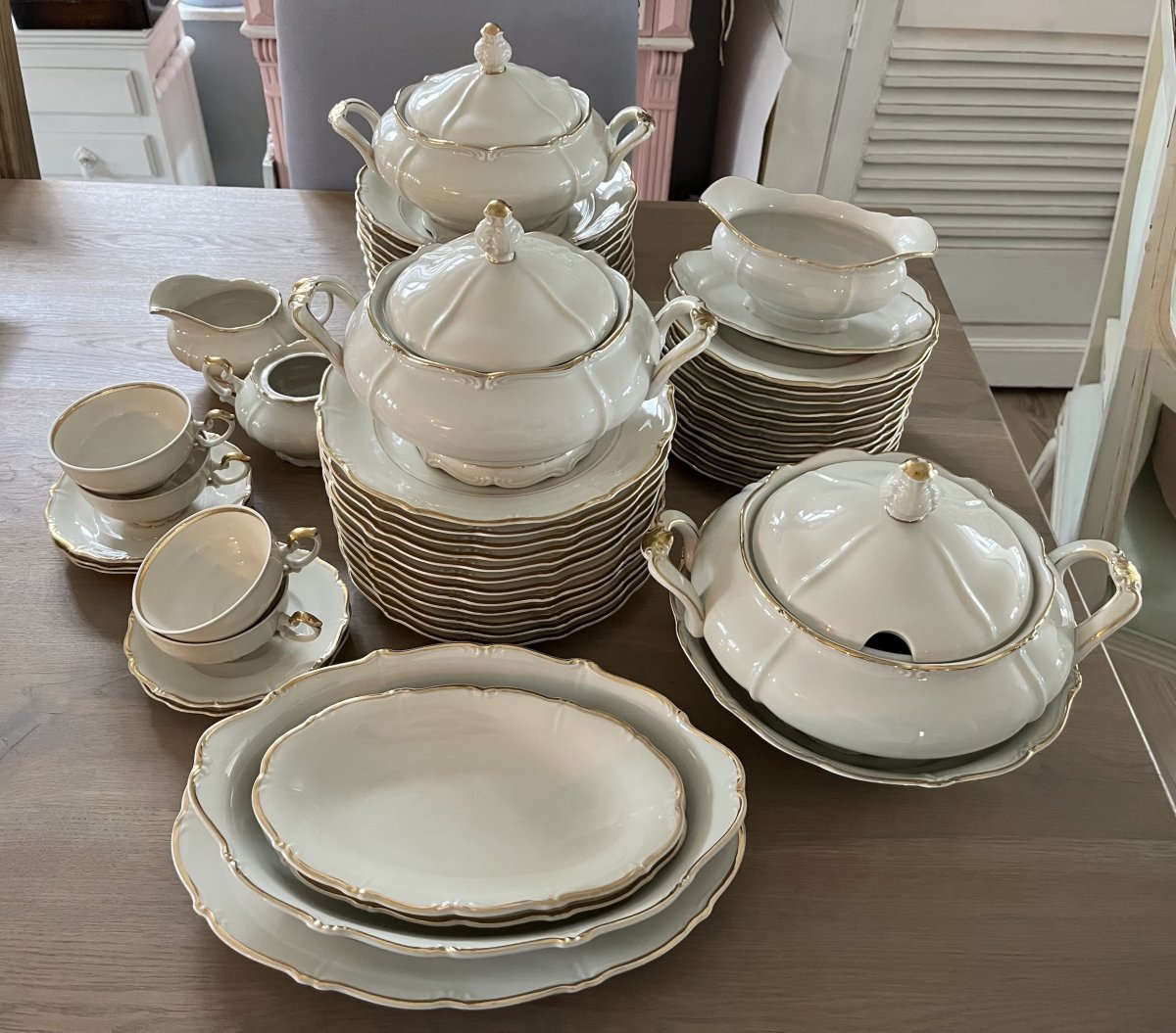 Prachtig Duits baroque servies. crème met goud. 12 diner-borden, 12 broodbordjes, 12 platte borden. Twee kleine dekschalen, éen grote. Juskom, slaschaal, twee platte schalen, ovalen schaal,4 kop en schotels, suikerpot {zonder deksel}, en melkkannetje.Alleen ophalen.
