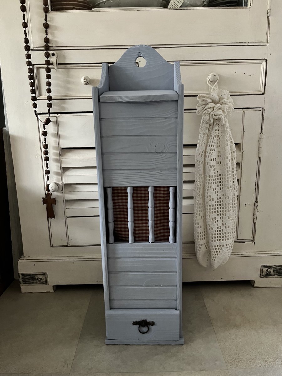 Frans stokbroden-kastje in lavendel grey.Extra opbergruimte in je brocante/landelijke keuken en geeft meteen sfeer!