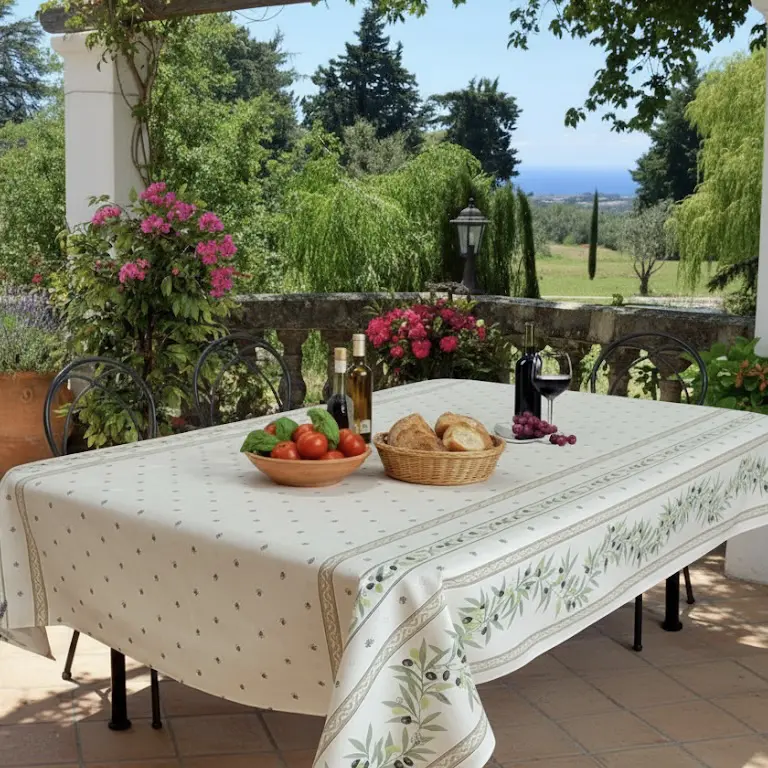 Frans tafelkleed Ramatuelle Olives roomwit is door Bellebien rechtstreeks voor u uit Zuid-Frankrijk geïmporteerd.