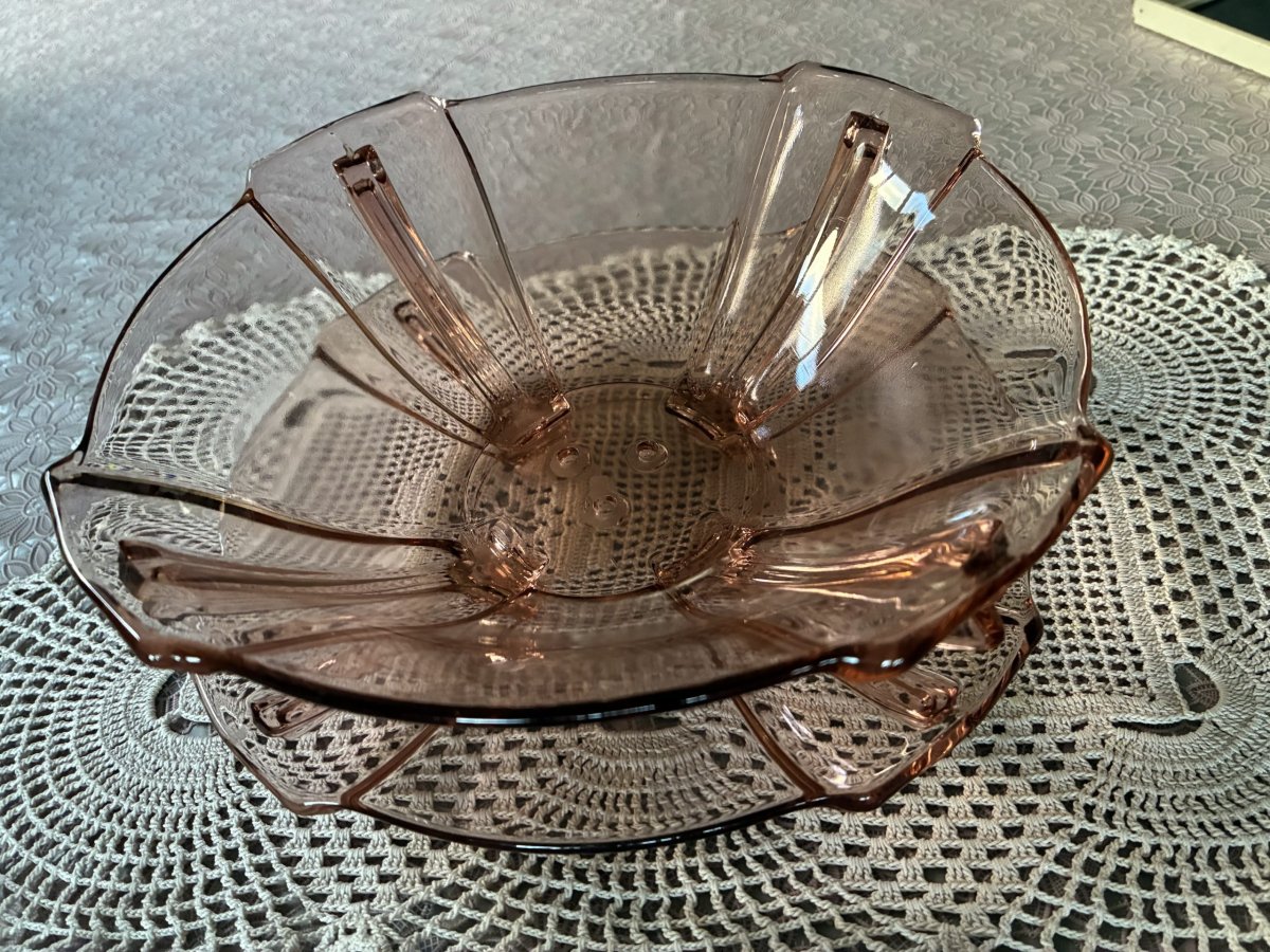 Prachtige uitlek schaal van oud roze glas. Nog helemaal gaaf.