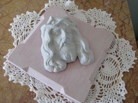 Houten wandplaatje met beeld van Jezus erop. Afm. 18 cm. bij 18 cm.