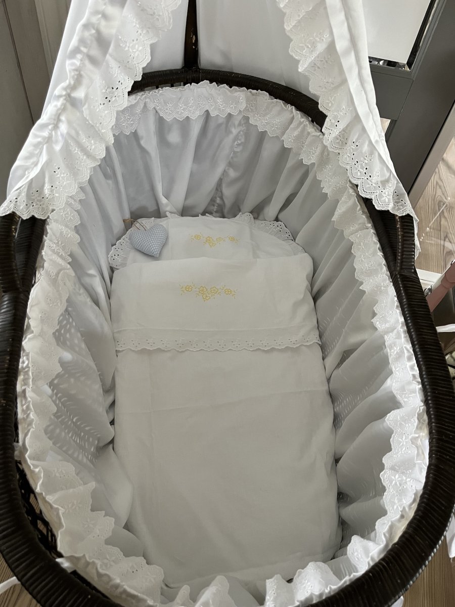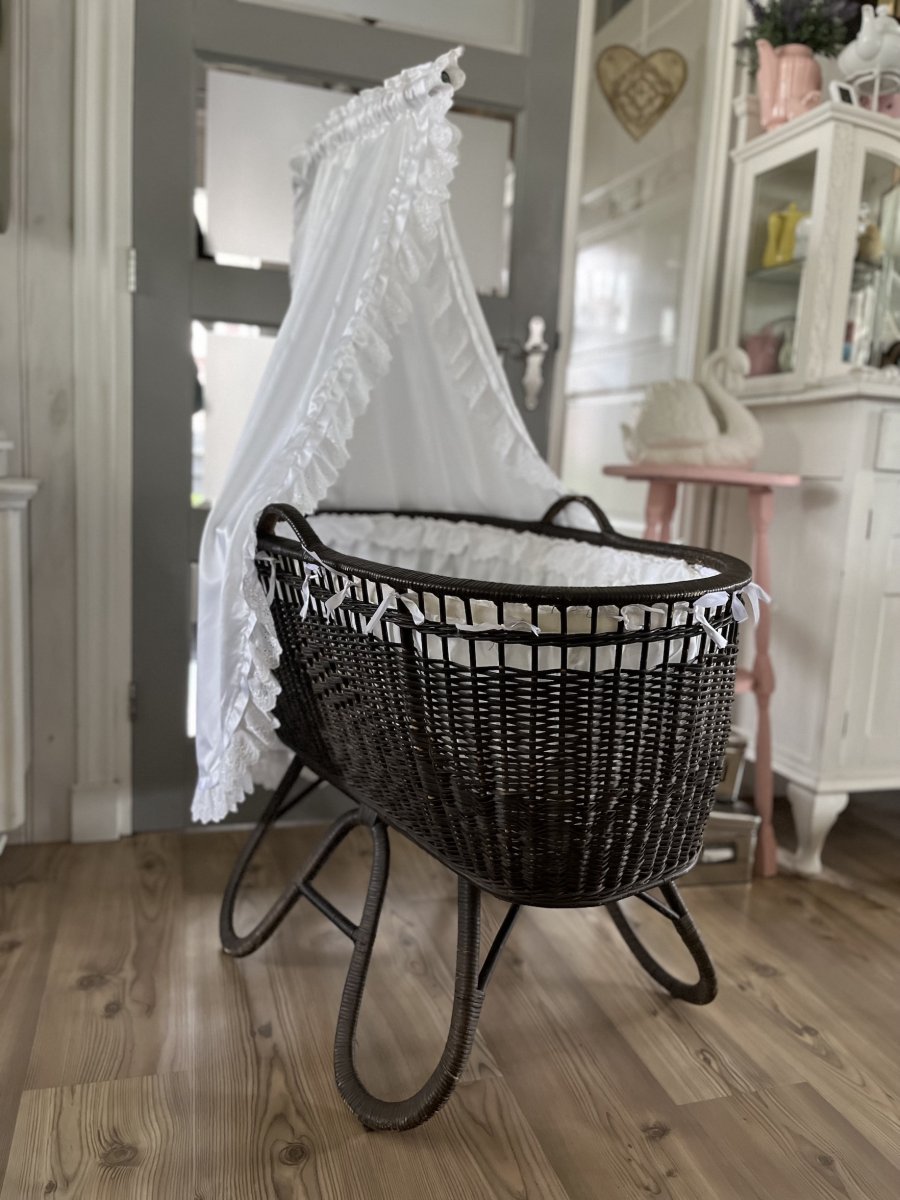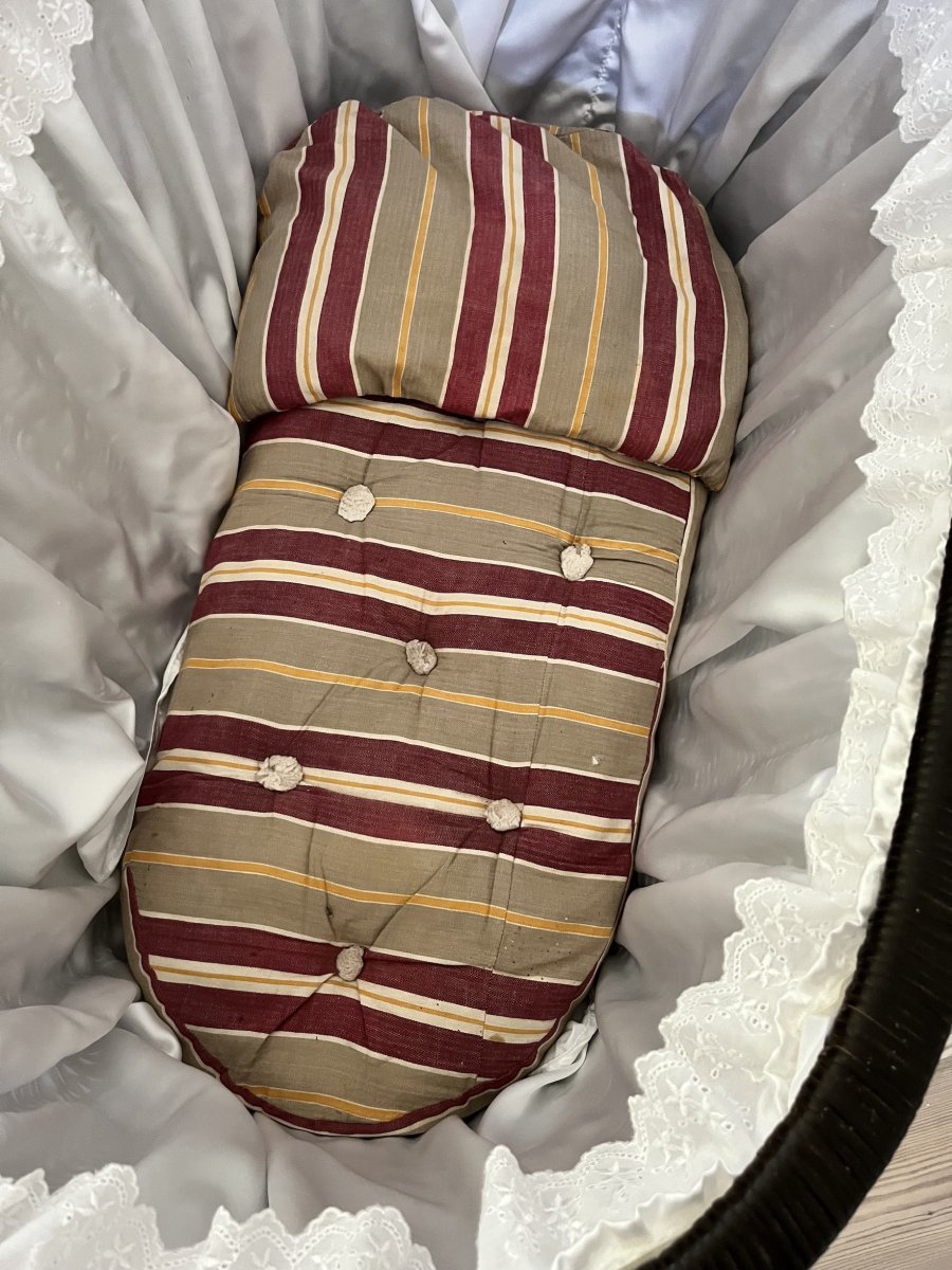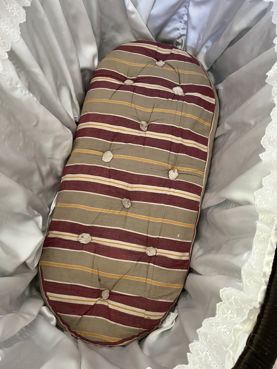 Oude, antieke wieg met satijnen bekleding afgezet met broderie. Er zit een oud matrasje en kussentje bij nog gevuld met stro. Zeer decoratief in bijvoorbeeld een etalage, winkel of museum. Of natuurlijk voor de babykamer.De piekstok is 1.40 hoog.
