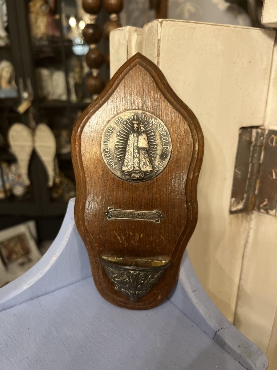 Houten wijwaterbakje met metalen details.